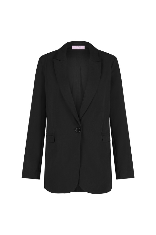 De Fran blazer uit de basiscollectie van Studio Anneloes combineert moeiteloos moderne stijl met een tijdloos karakter. Deze zwarte boyfriend blazer heeft klepzakken die naar binnen gevouwen kunnen worden, waardoor je eenvoudig paspelzakken creëert. Het model is voorzien van schoudervullingen en iets wijde mouwen met knopen, wat zorgt voor een stoere en zelfverzekerde uitstraling. De langere lengte van de blazer valt over de heupen, wat het perfect maakt voor een gelaagde look.