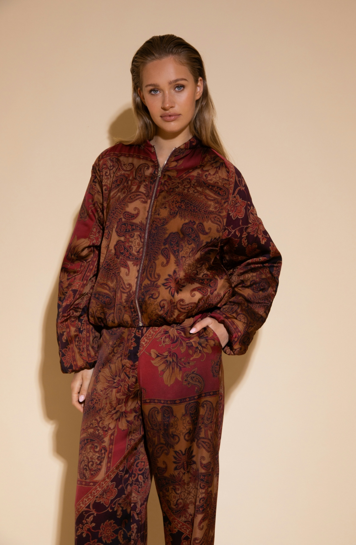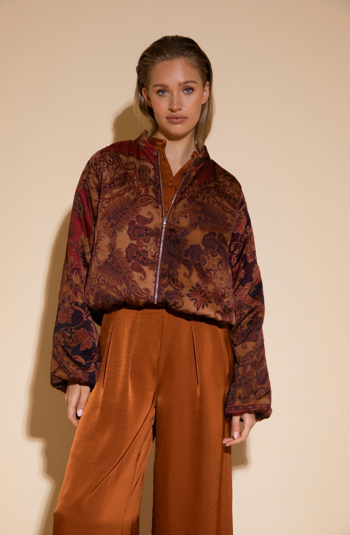 Productinformatie: De Faith Bomber is de bestseller van vorig jaar en niet zonder reden. De bomber pasvorm is speels en vrouwlijk. Het viscose materiaal heeft een licht glans. Het materiaal straalt pure elegantie uit dankzij de rijke paisleyprint in diepe bordeaux- en bruintinten. De Bomber heeft een ritssluiting, twee paspelzakken, en wijdere ballon mouwen. Materiaal: 100% Viscose