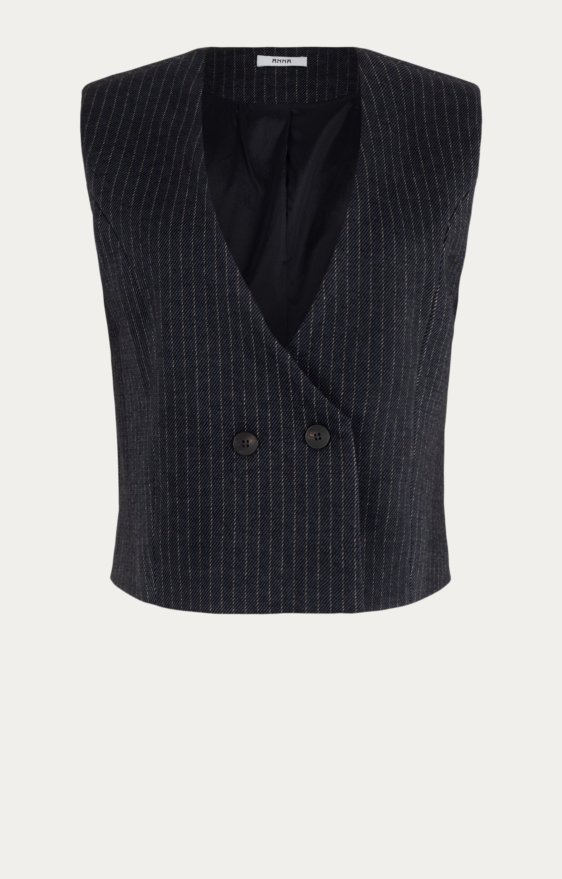 Omschrijving: Dit gilet van Anna is uitgevoerd in een donkere tint met subtiele krijtstreep. Het double-breasted model sluit met twee knopen en is volledig gevoerd voor extra draagcomfort. Dankzij de mix van polyester, viscose, metaal en elastaan heeft het gilet een lichte glans en een prettige pasvorm. Een veelzijdig item dat perfect aansluit bij de wintergarderobe.