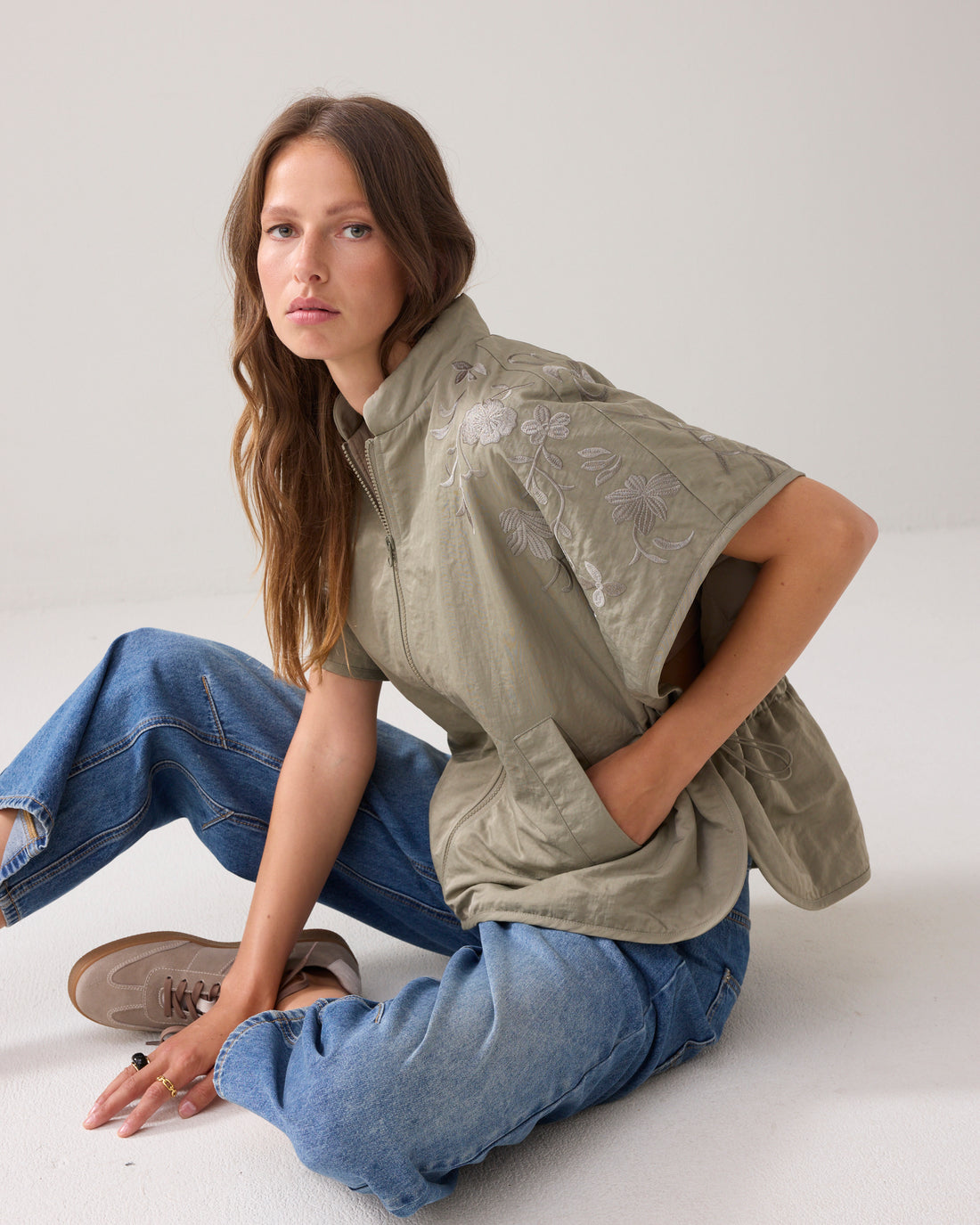 Omschrijving: Dit lichtglanzende gilet is gevoerd en gewatteerd, en uitgevoerd in een stevige stof. Het gilet is rijkelijk versierd met ton-sur-ton borduurwerk op de schouders aan de voor- en achterkant. Het elastiek in de taille is naar wens te verstellen. Leuk te dragen over een colbertje, jasje of blouse.