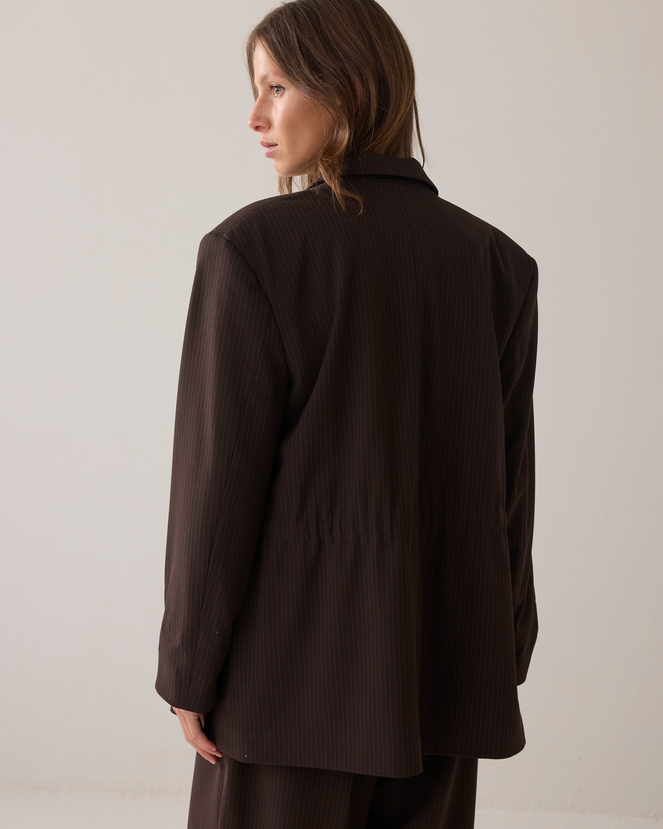 Gevoerde blazer in dark chocolate pinstripe. Dankzij het elastiek aan de achterkant kun je de taille aansnoeren voor een meer getailleerd silhouet, of kiezen voor een nonchalante boyfriend fit. De blazer is voorzien van klepzakjes aan de voorkant. Ga voor de co-ord look met de bijpassende broek: 4s2892.