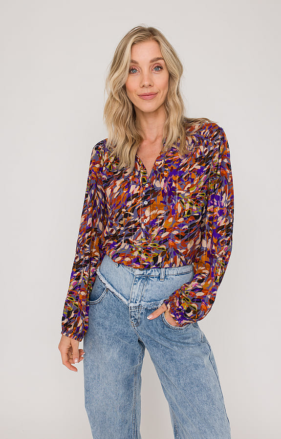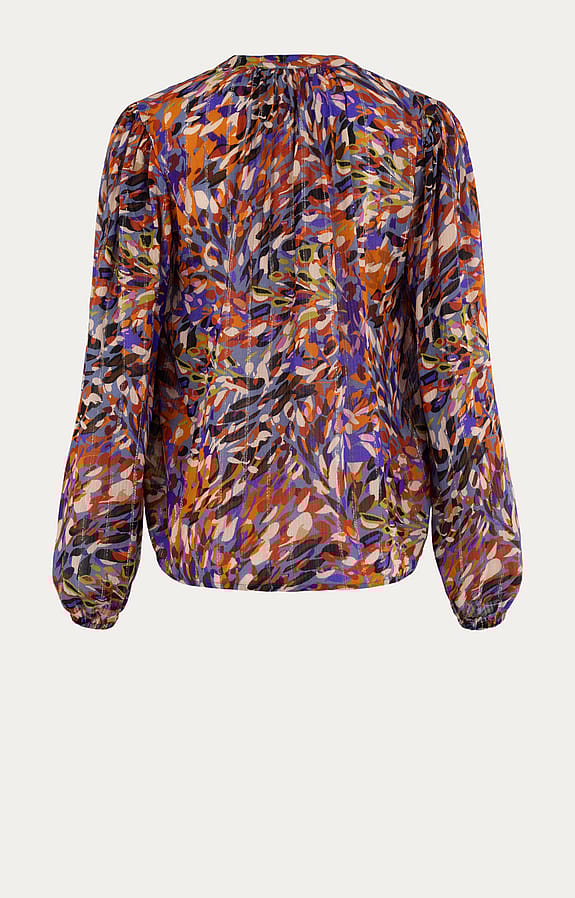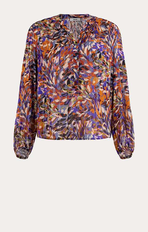 Deze blouse van Anna is gemaakt van een lichte viscosemix met subtiele lurexdetails, waardoor het kledingstuk een subtiele glans heeft. De ronde halslijn met V-inkeping en parelmoerige knoopsluiting tot halverwege geeft een verfijnde uitstraling. De lange mouwen hebben elastische boorden voor extra comfort, terwijl het all-over dessin zorgt voor een levendige uitstraling. Geplooide details aan de achterzijde voegen een subtiel accent toe aan het geheel.