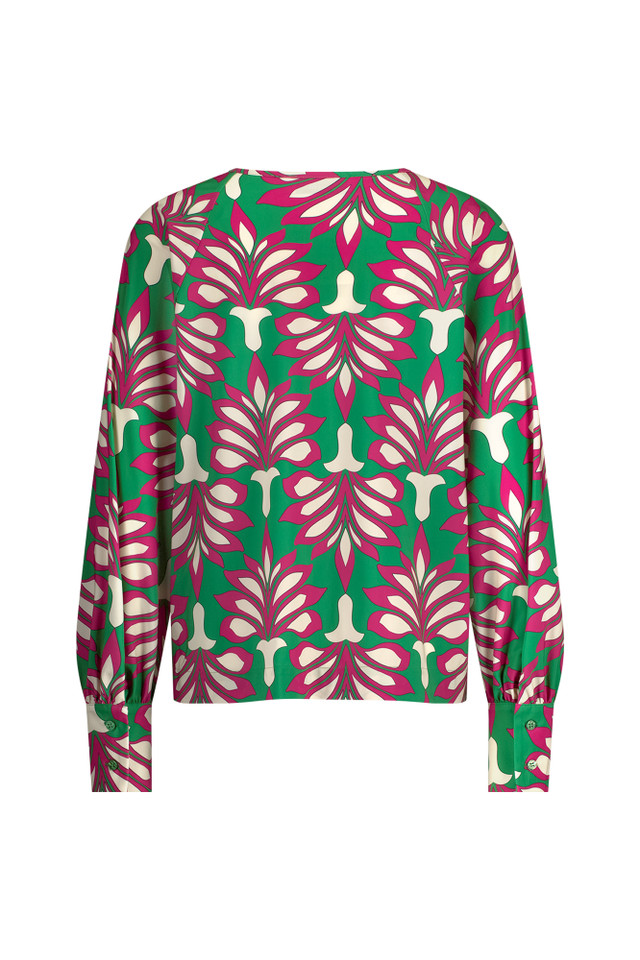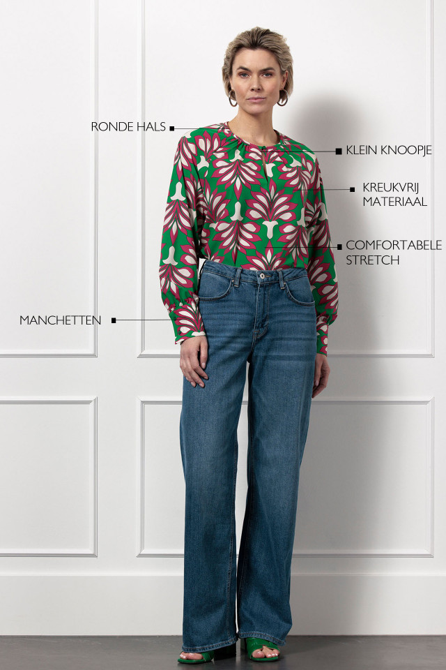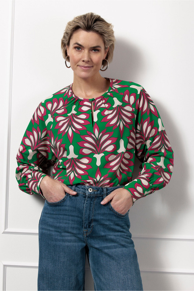 Omschrijving: De Charleze lotus top van Studio Anneloes is een speelse en stijlvolle eyecatcher. De kleuren Clover Green, Cerise en Off White komen prachtig tot leven in de lotusprint, die zorgt voor een frisse en modieuze uitstraling. Dankzij de regular fit en de soepele Medium Travelstof voelt de top comfortabel aan en beweegt hij mooi met je mee. De ronde hals met een subtiel knoopdetail geeft een verfijnde touch, terwijl de lange mouwen met manchetten zorgen voor een elegante afwerking.