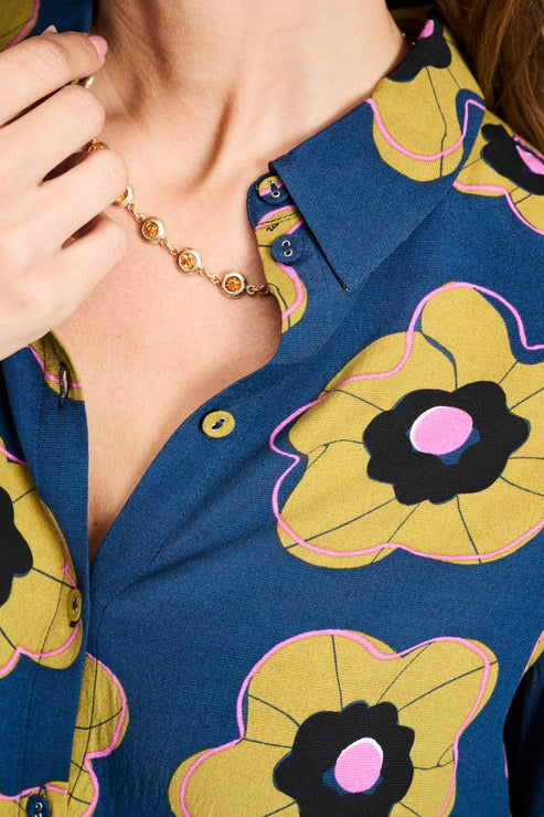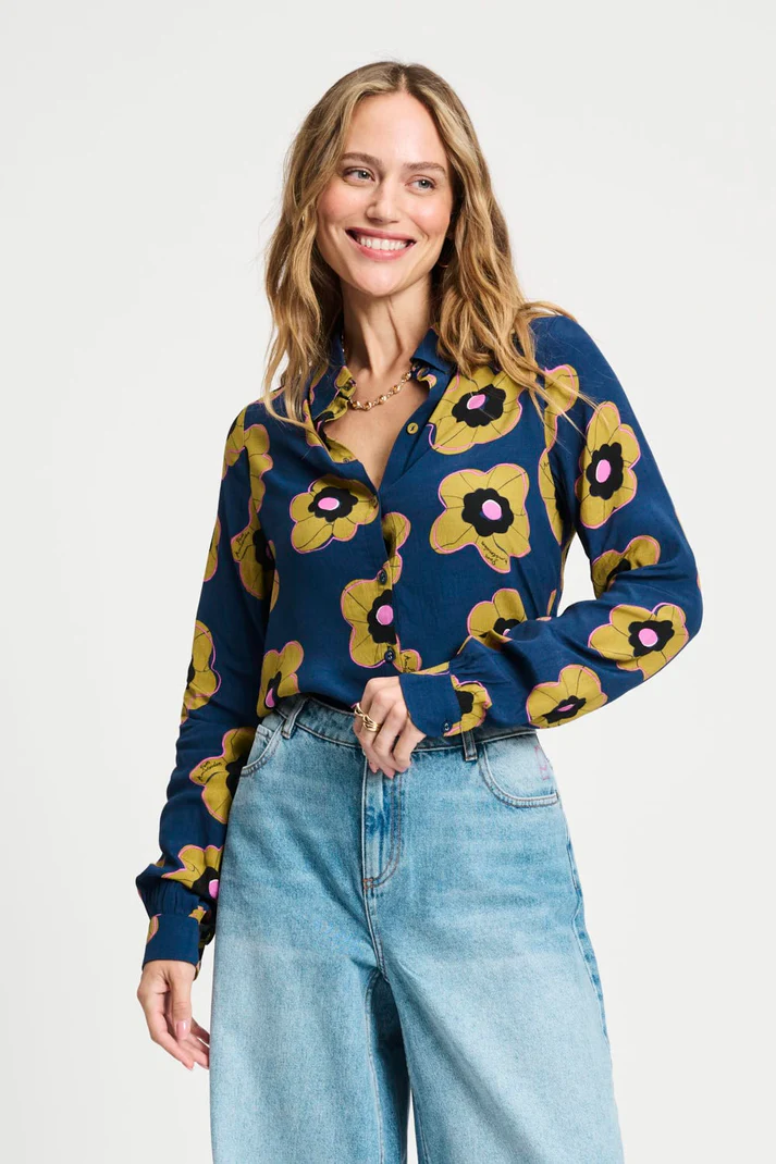 Deze donkerblauwe blouse met grafische bloemenprint geeft je look meteen kleur en karakter....meer