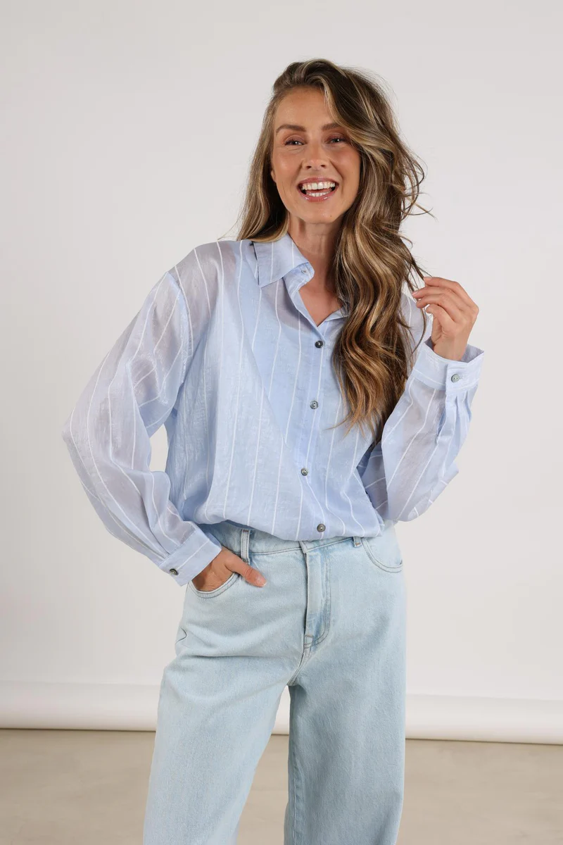 De Iris blouse is een tijdloos item met een moderne twist. Deze blouse met off white strepen is gemaakt van een zachte mix van tencel en katoen en heeft een regular fit. De fijne knoopsluiting en luchtige stof maken het de perfecte keuze voor een casual, maar verzorgde look. Style hem af met je favoriete abby jeans of jill pantalon.