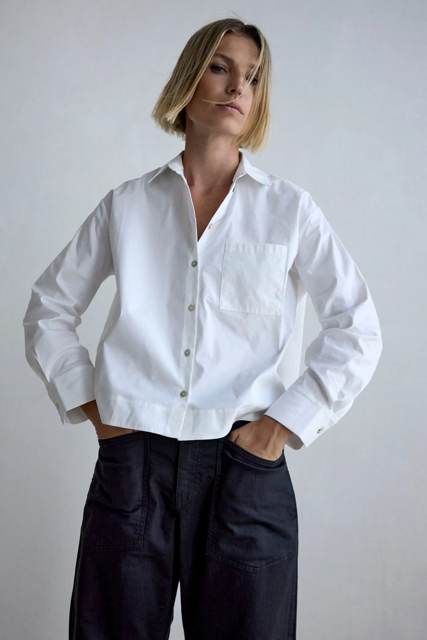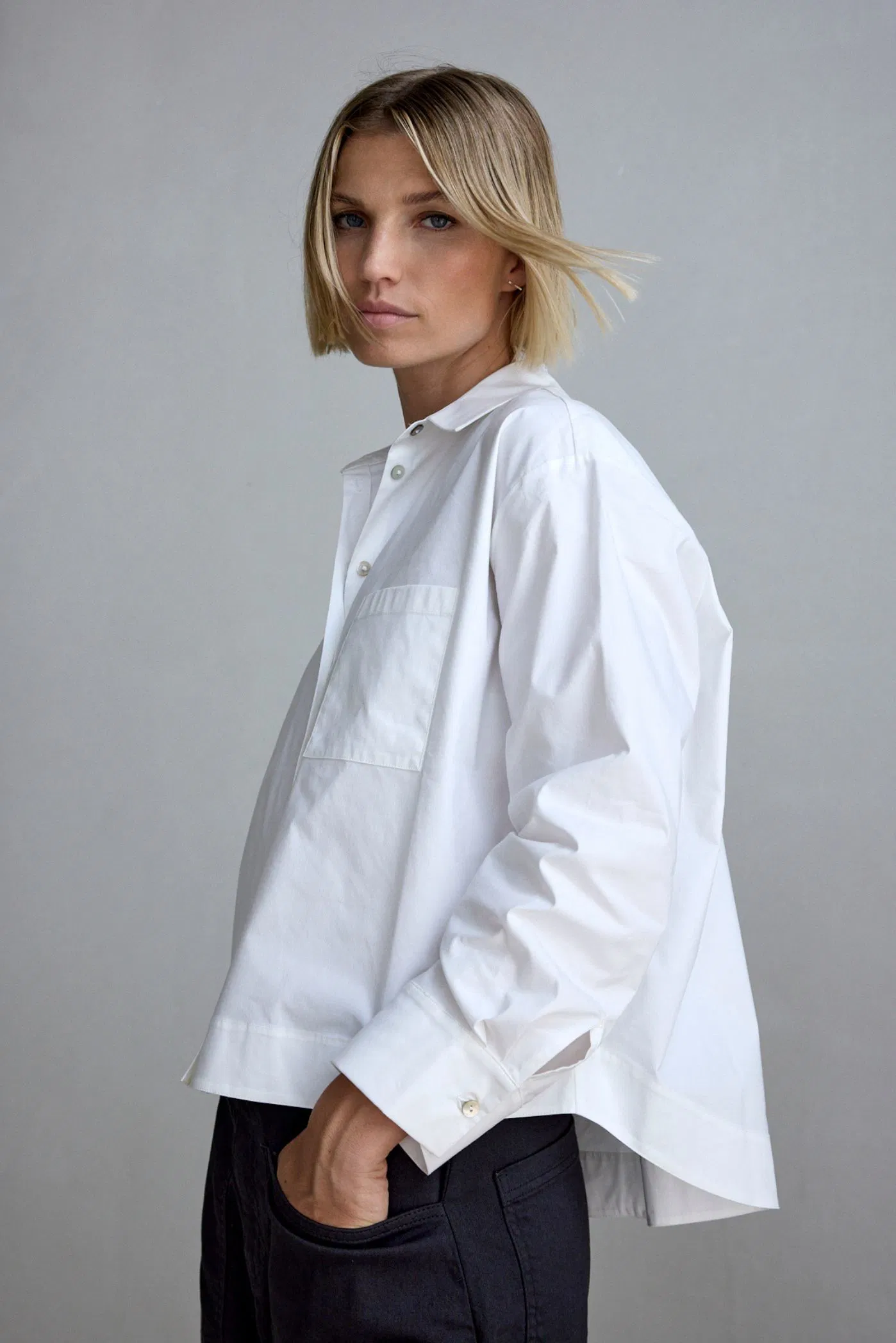 Omschrijving: Een stevige katoenen blouse met een brede boord aan de onderkant welke wat wijder uitloopt. Met een knoopsluiting en kraag is het een ideaal item om deze zowel stoer als heel gekleed te dragen.