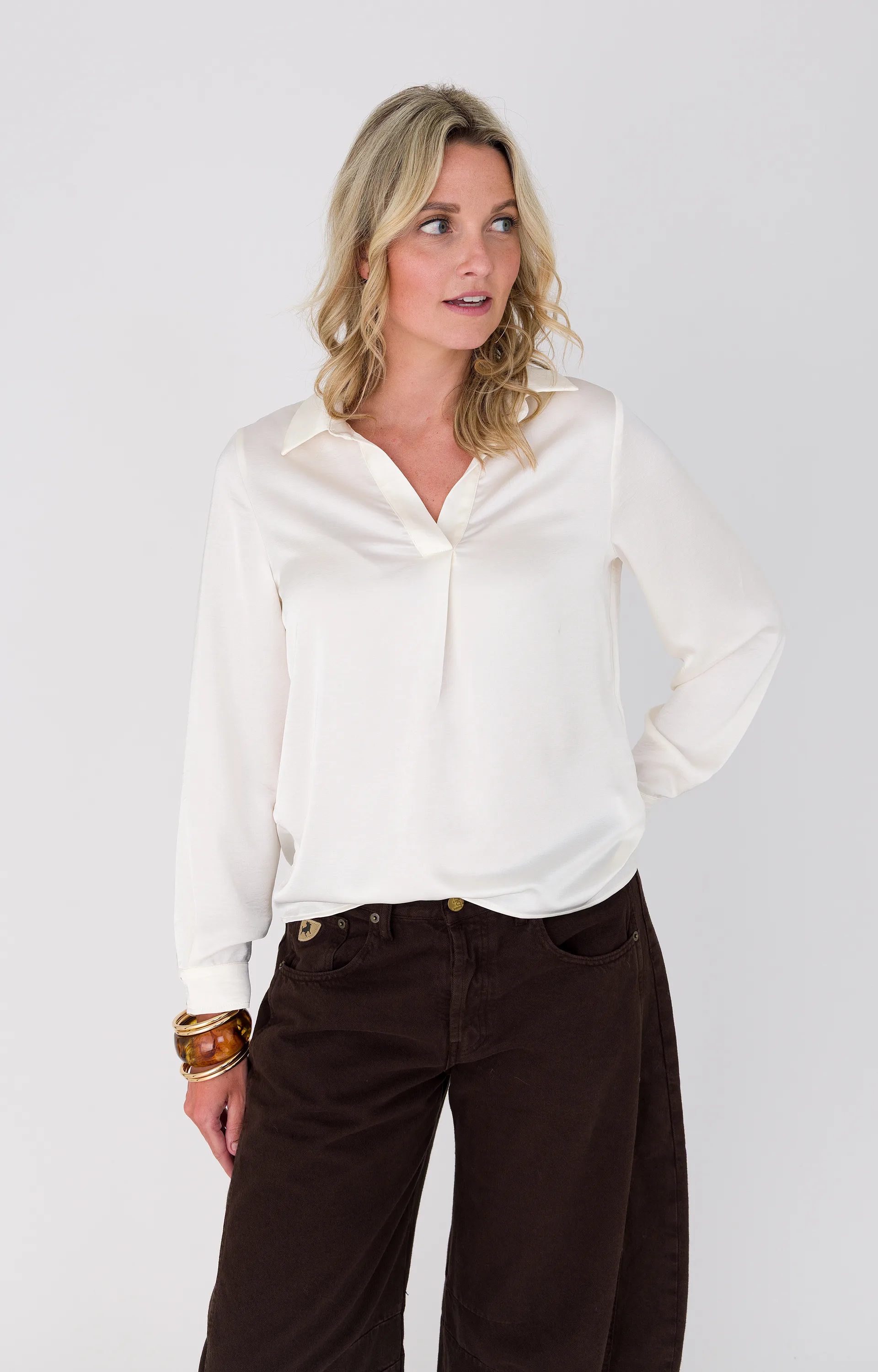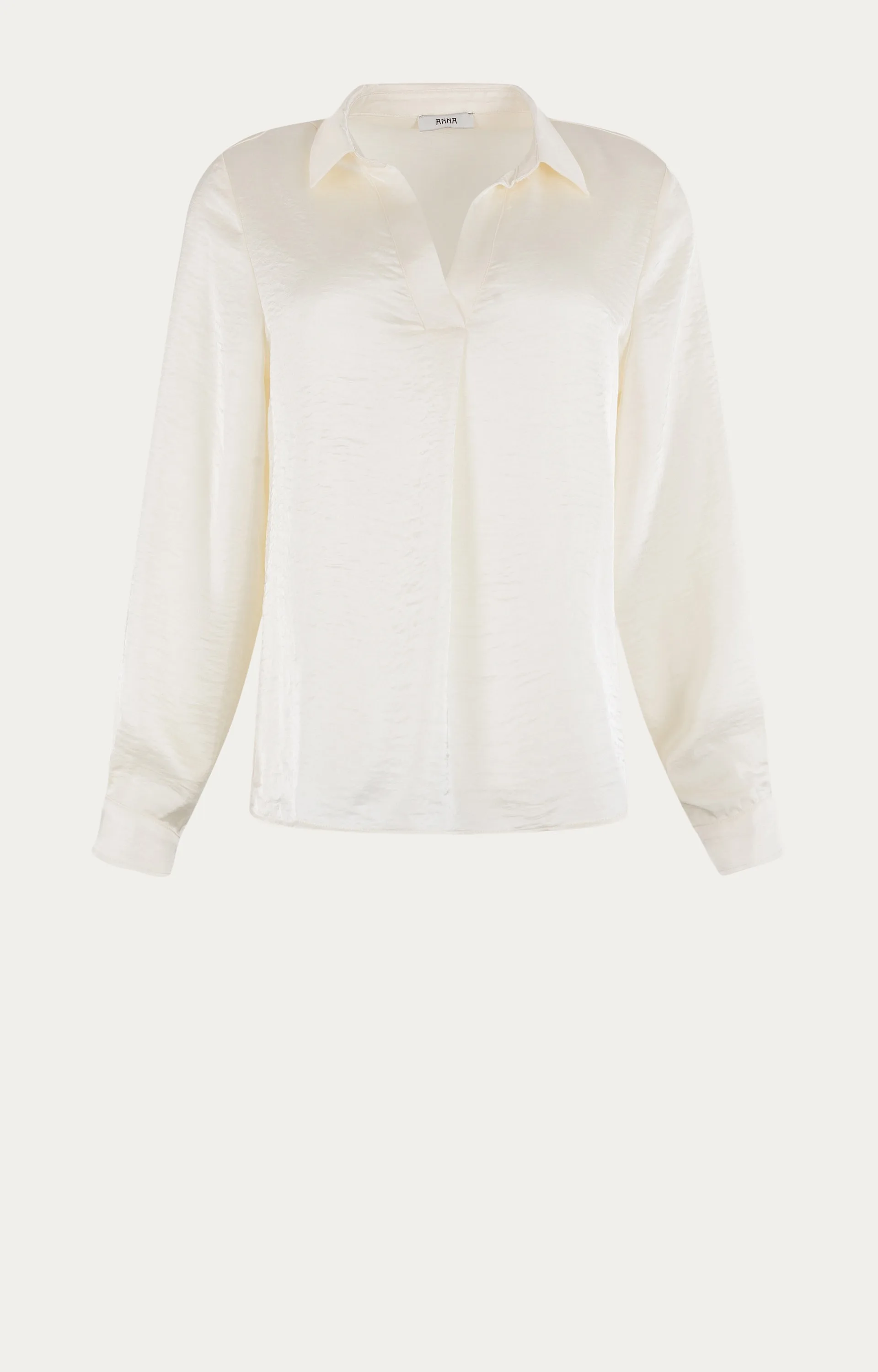 Deze blouse van ANNA is uitgevoerd in een soepele polyesterkwaliteit met een satijnlook. De blouse heeft een V-hals, klassieke kraag en lange mouwen met manchetten. Door de rechte snit valt het model losjes rond het lichaam. De glanzende off-white stof geeft een verzorgde uitstraling, geschikt voor diverse gelegenheden. Een veelzijdige aanvulling op de garderobe.