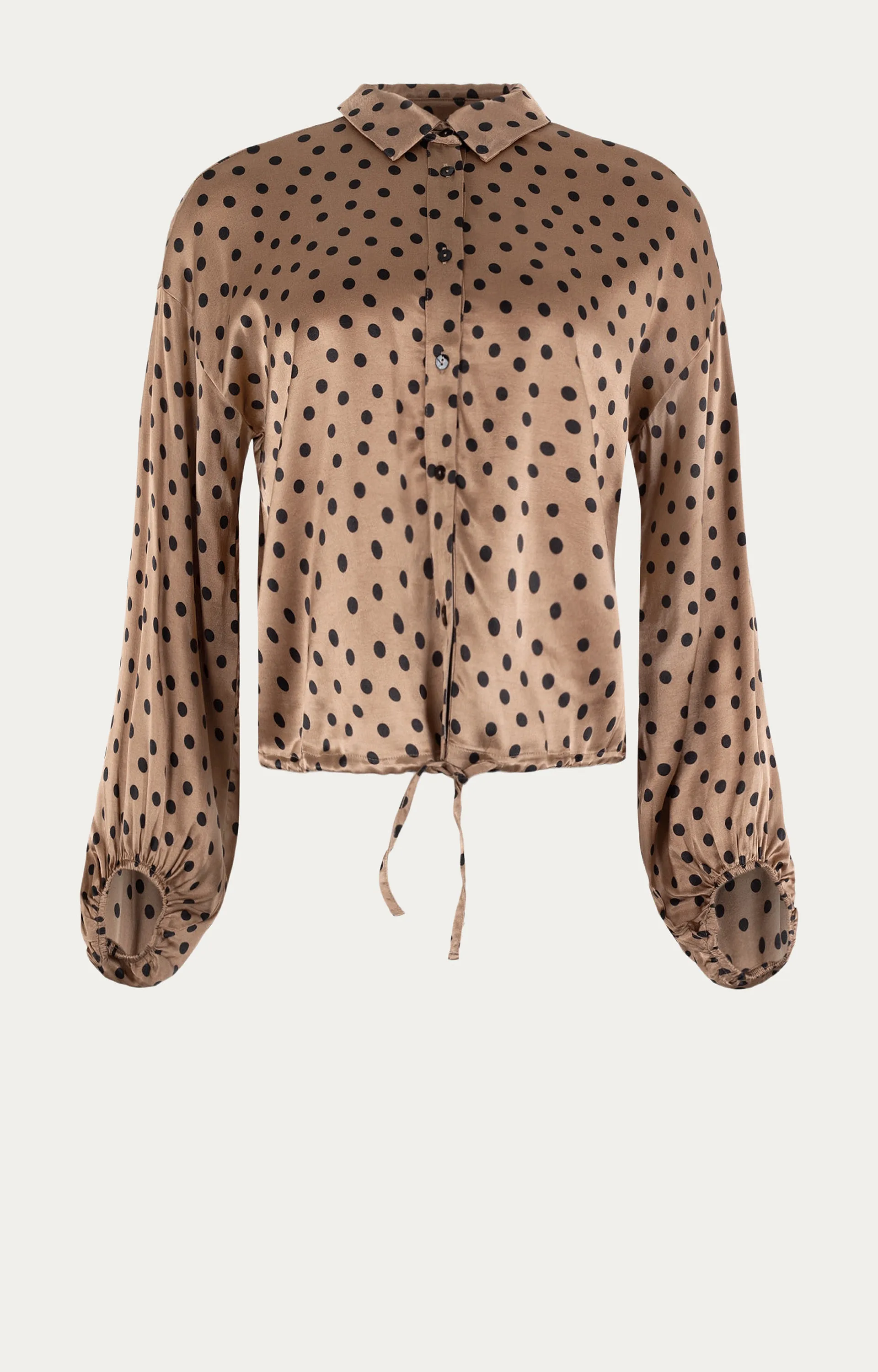 Deze Anna blouse is gemaakt van viscose en uitgevoerd in een light camel kleur met zwarte polkadots. De glanzende stof en de speelse print geven het ontwerp een opvallend karakter. De blouse heeft een knoopsluiting aan de voorzijde, een trekkoord in de zoom en elastische manchetten. De geplooide mouwen zorgen voor extra volume en een unieke uitstraling. Perfect voor het winterseizoen.