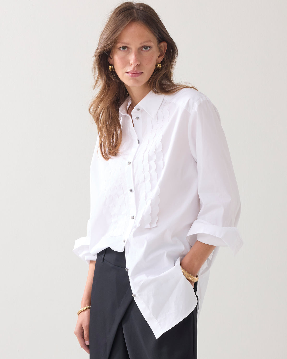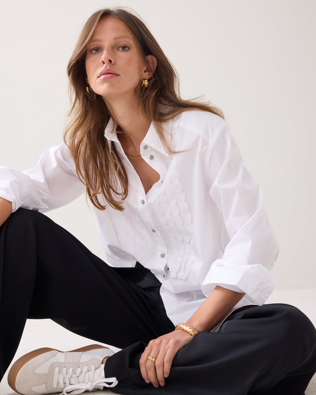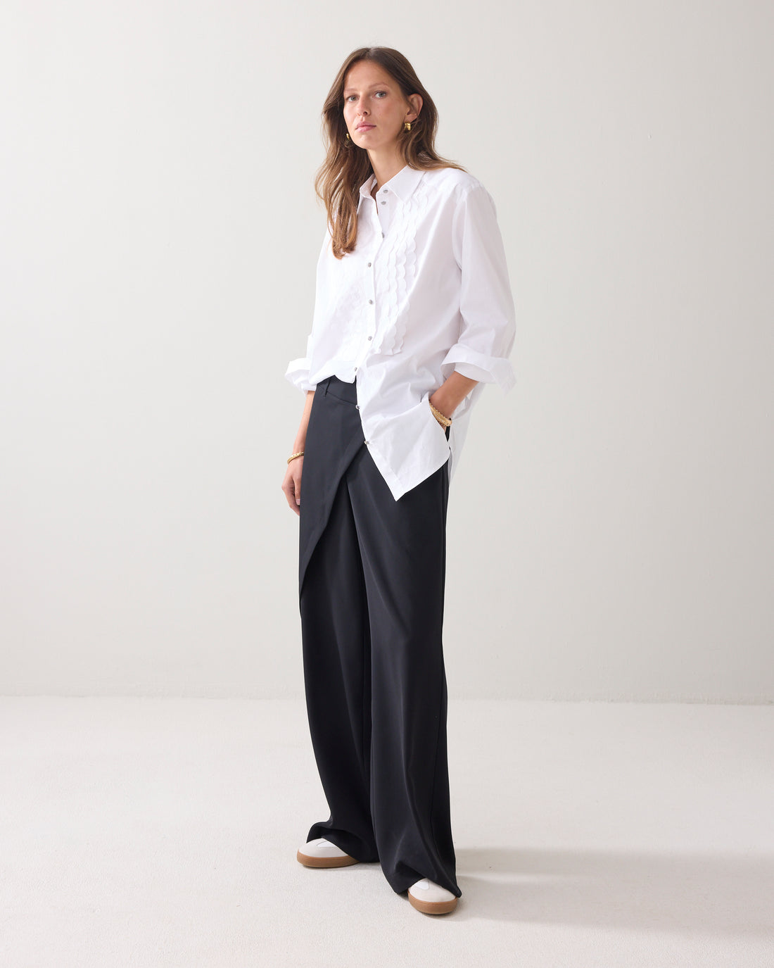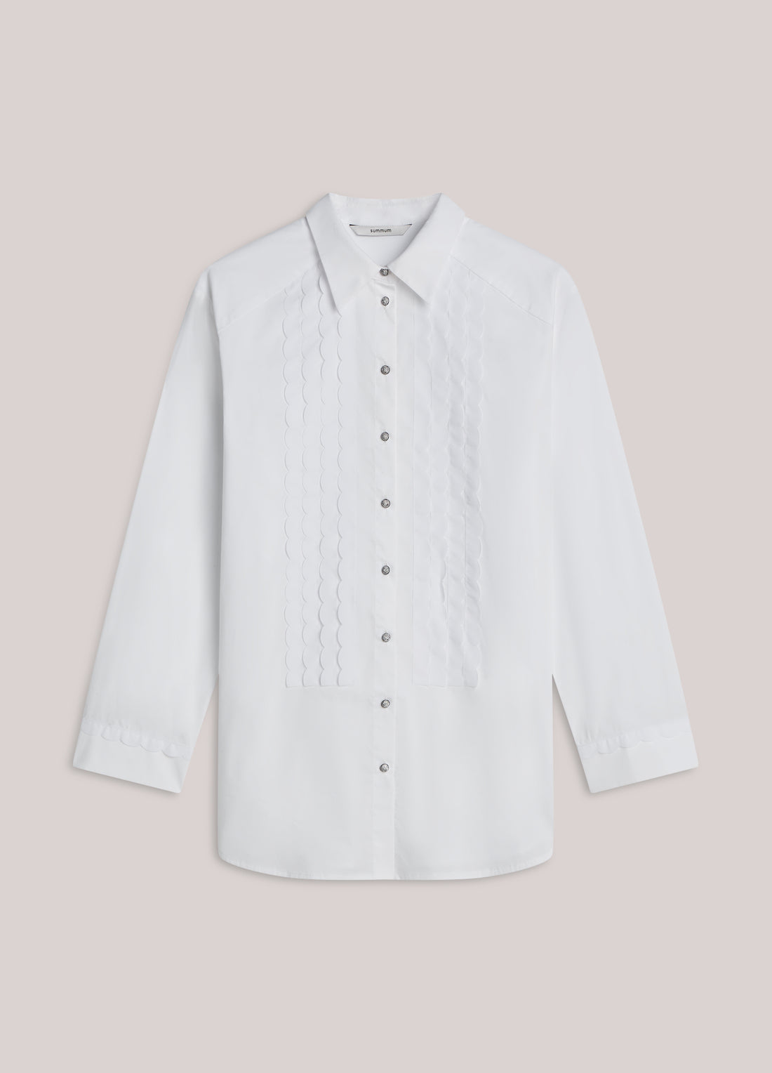 Omschrijving: Overhemdblouse van stevige poplin met smokingdetails. Afgewerkt met lasercut stroken en diamantknoopjes. Ook op de manchetten zijn lasercuts en een knoopje toegevoegd.