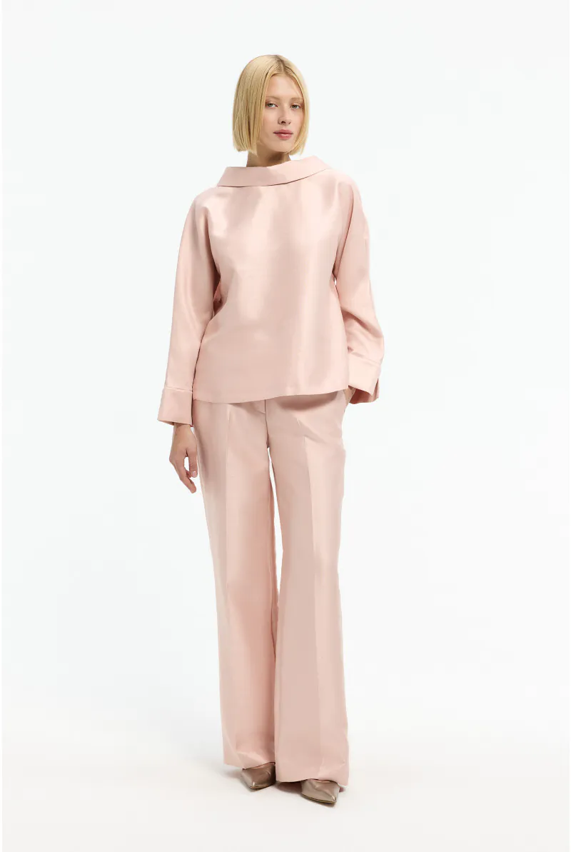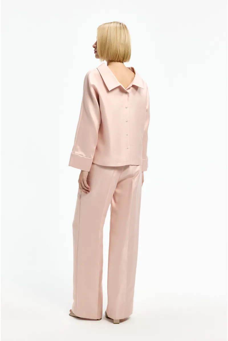 Omschrijving: Deze blouse komt met een twist. Je kan de knoopsluiting vooraan of achteraan dragen. De zijden look straalt elegante luxe uit en tilt elke outfit meteen naar een hoger niveau.