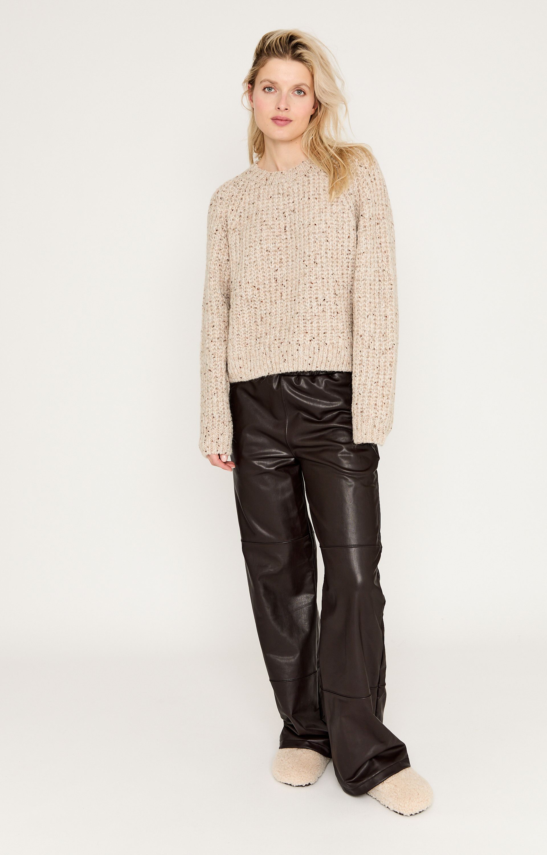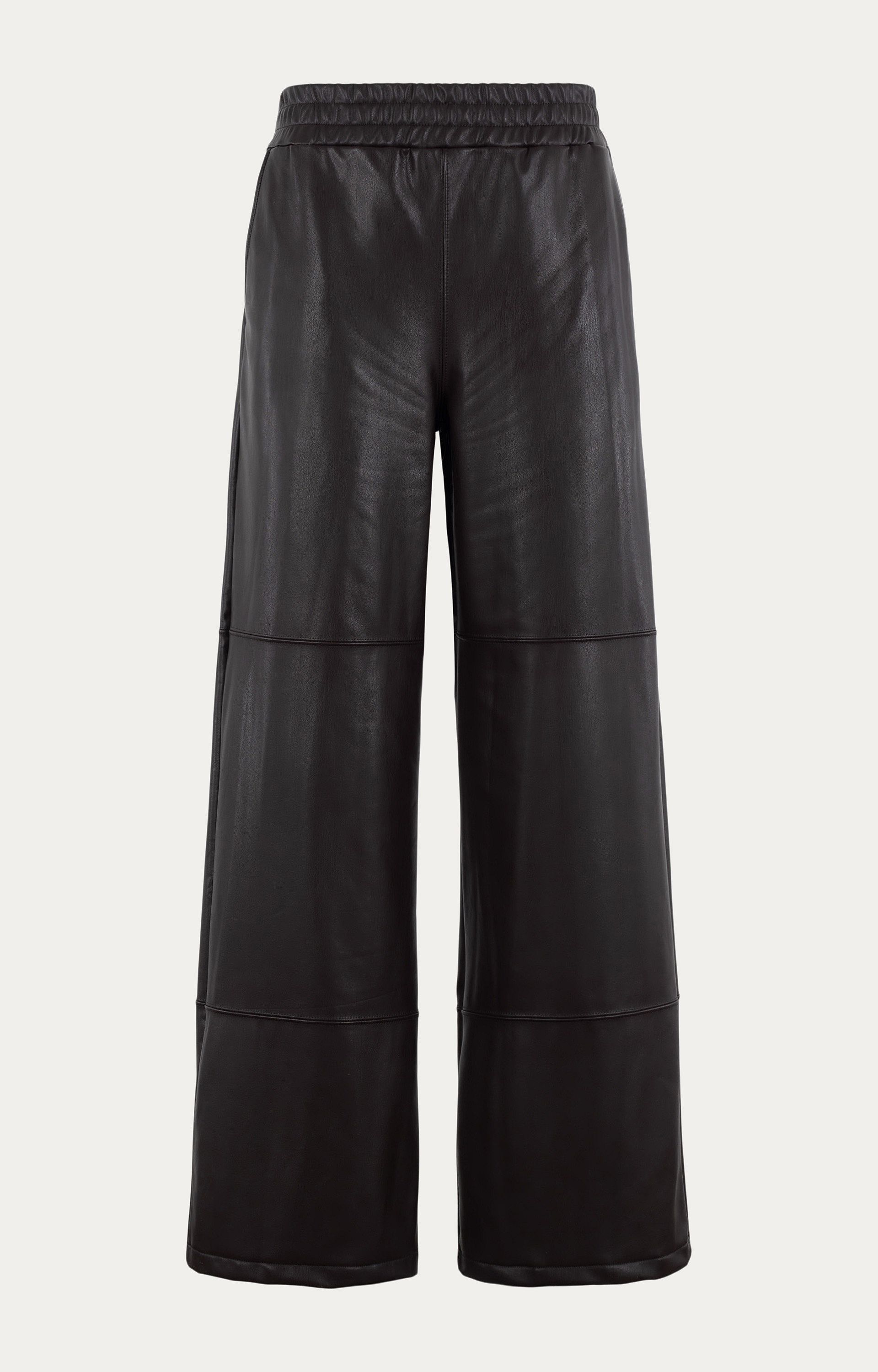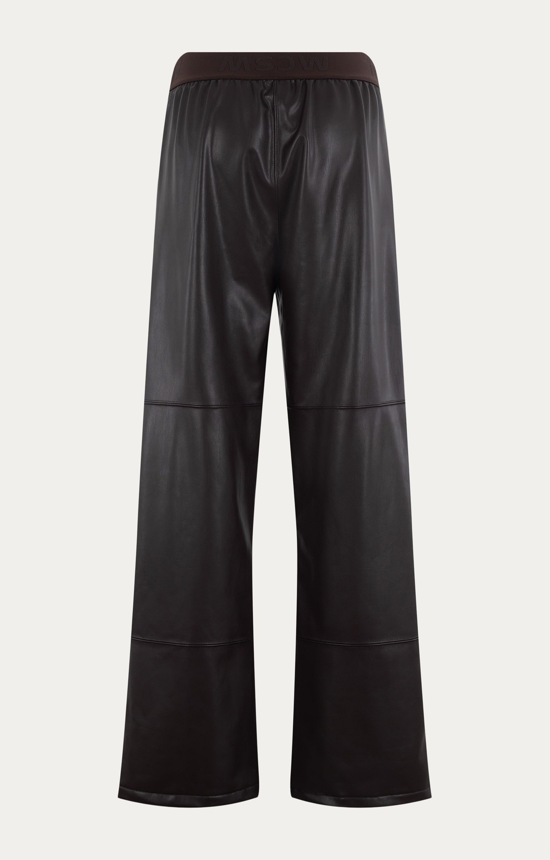 Omschrijving: Deze broek van Moscow in de kleur dark brown is een moderne keuze voor het winterseizoen. Het model heeft een leather look finish en is gemaakt van een soepele mix van polyester, polyurethaan en elastaan. De wide leg pasvorm wordt geaccentueerd door het naaddetail op het been. Dankzij de elastische tailleband en steekzakken biedt de broek zowel comfort als functionaliteit. Combineer met een knit of blouse voor een krachtige, alledaagse look.