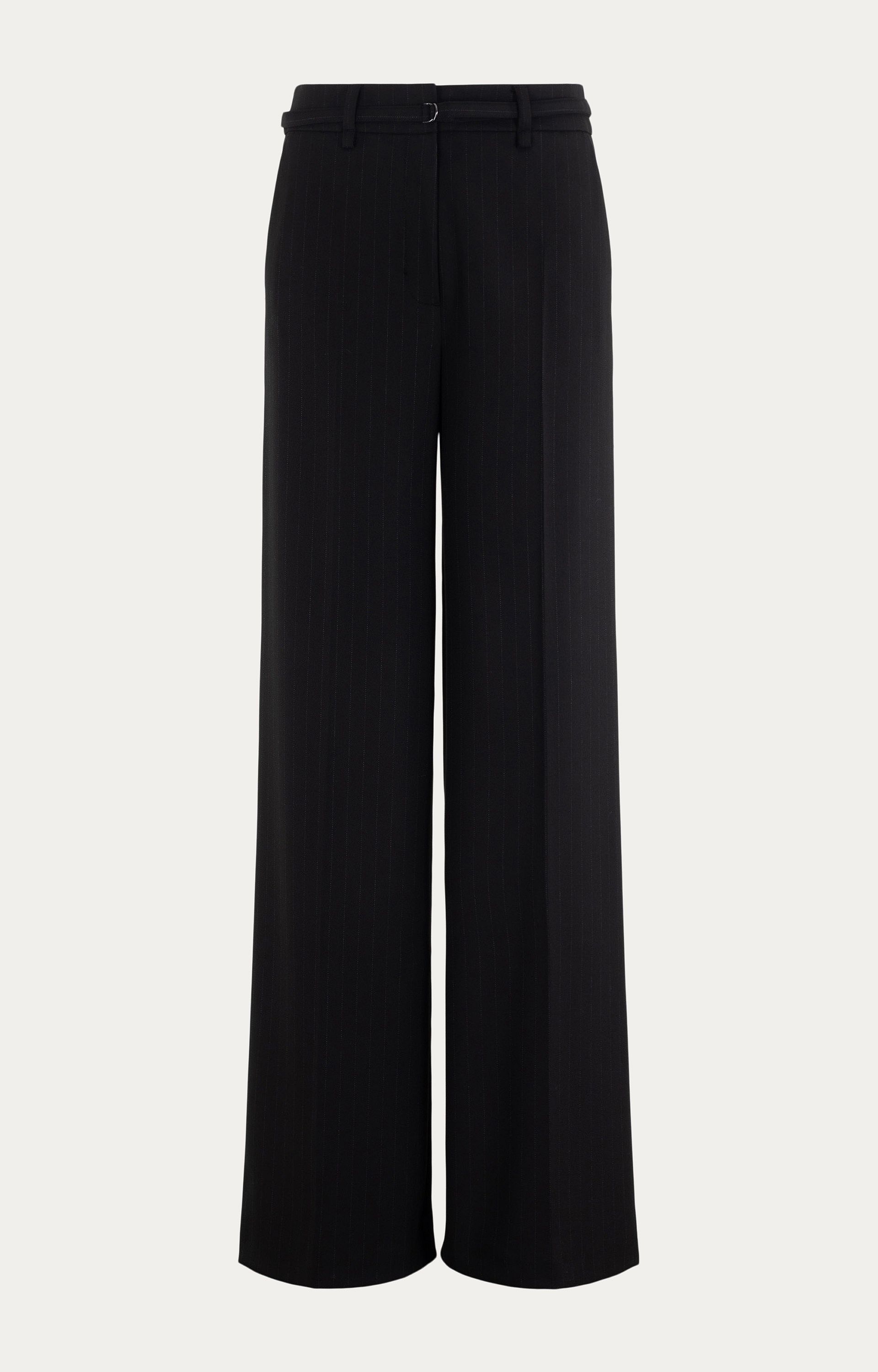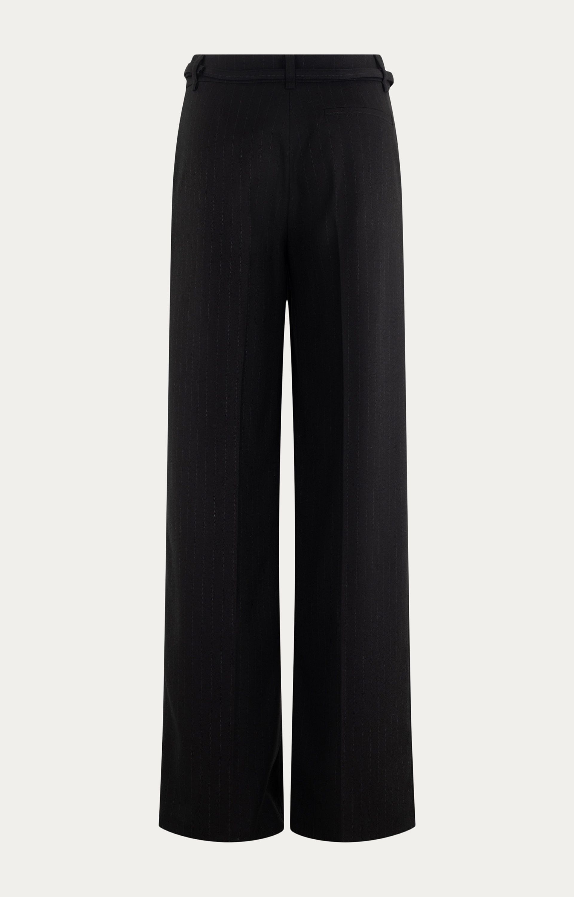 Details: Krijtstreep, hoge taille, ceintuur om de middel, rechte pijpen