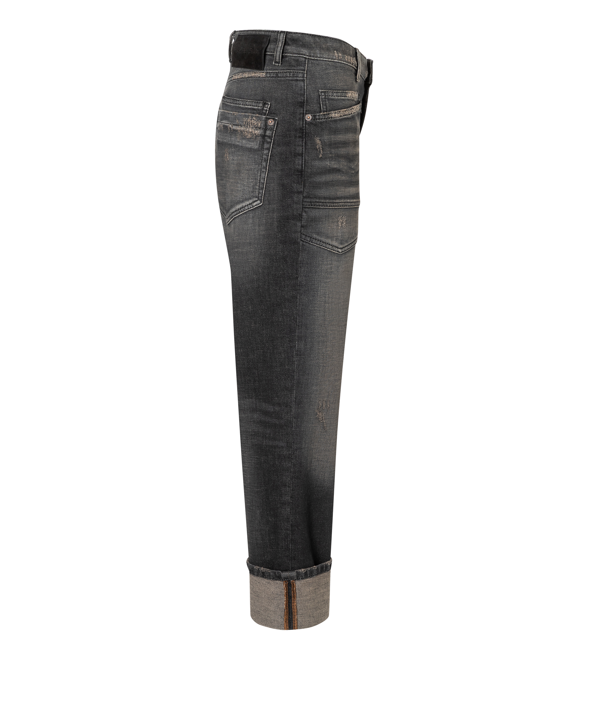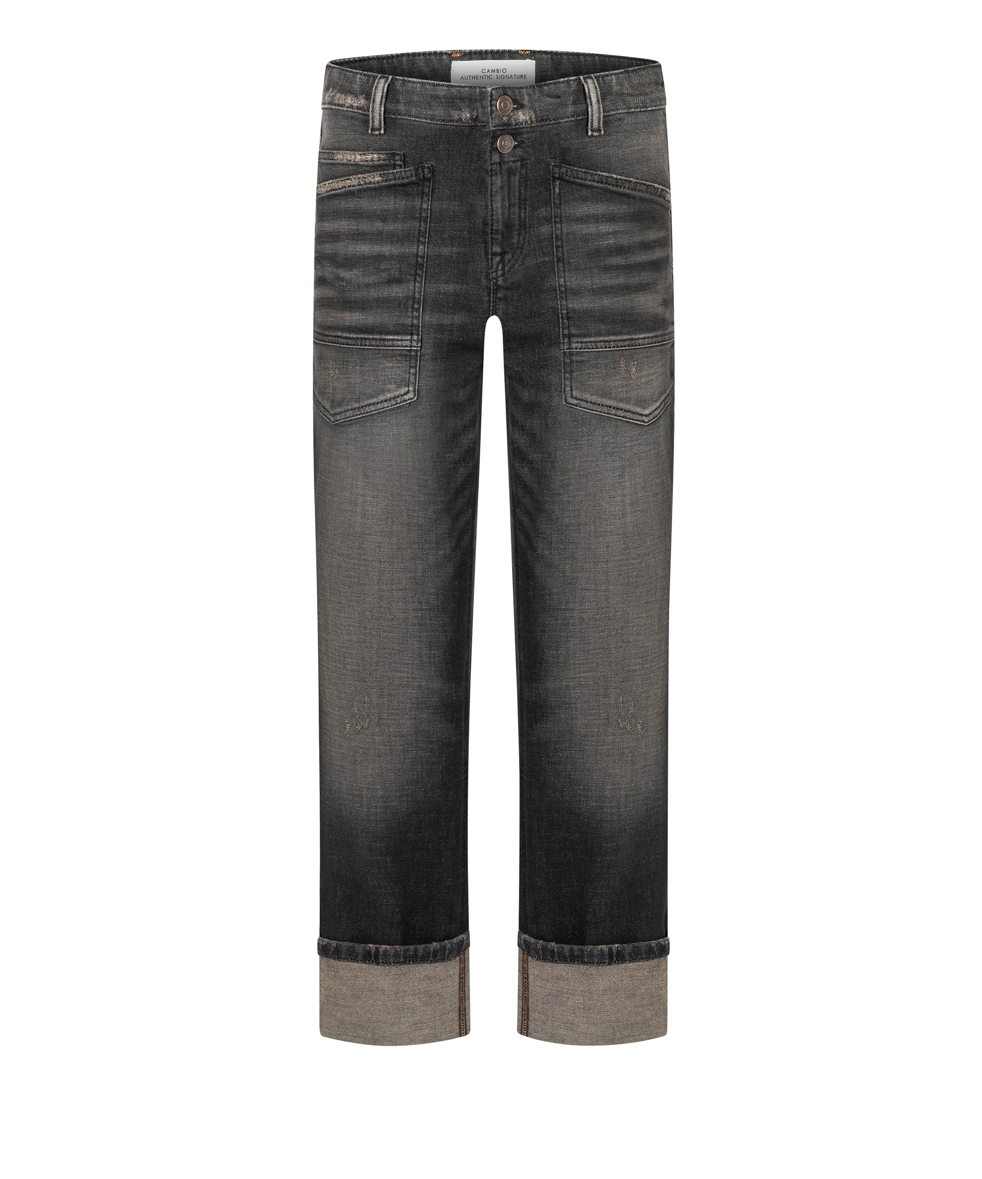 Omschrijving: GUILI jeans in een cropped lengte. Deze denim met zijn rechte pasvorm en grote opgestikte zakken zorgt voor een sportieve look. De omgeslagen zoom en de knoopsluiting zorgen voor een moderne vintage look.