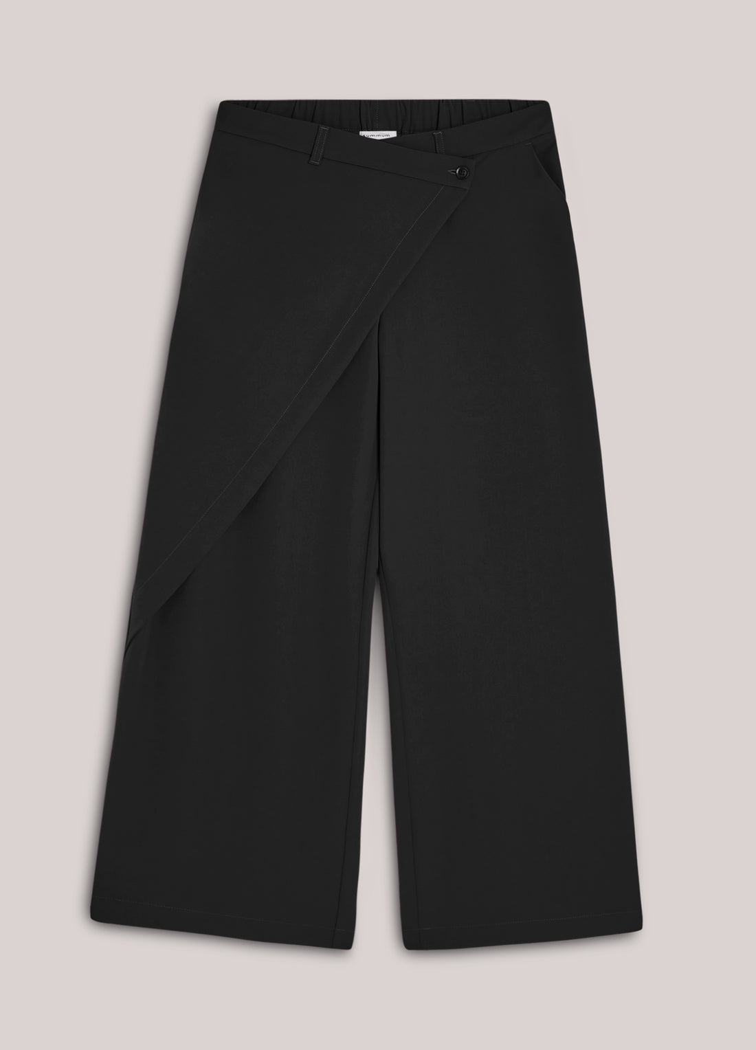 Omschrijving: Wijde broek met aan de voorzijde een overslag vanuit de zijnaad. De broek heeft een gladde tailleband voor en een elastische achter. Op de achterkant zitten strookzakken.