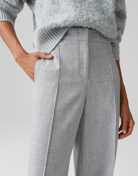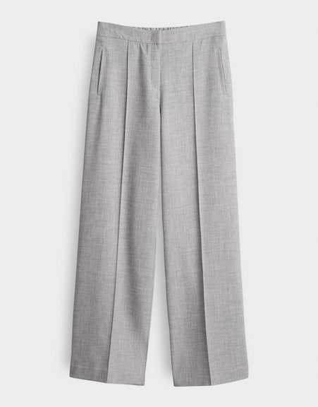 Omschrijving: Deze Marlene-broek valt op door zijn lange, wijde pijpen en opvallende vouwen die het silhouet optisch verlengen. Ontworpen in een fijne gemêleerde look, is het een zakelijke stijl met een vrouwelijke uitstraling.