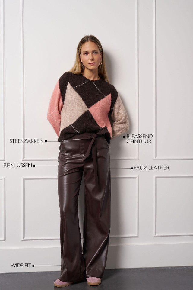Omschrijving: De Lexie faux leather trousers van Studio Anneloes is een krachtige mix van stoer en stijlvol. De diepe kleur Espresso en de wijde pijpen geven dit item een moderne uitstraling, terwijl de combinatie van faux leather en travelstof zorgt voor extra comfort.