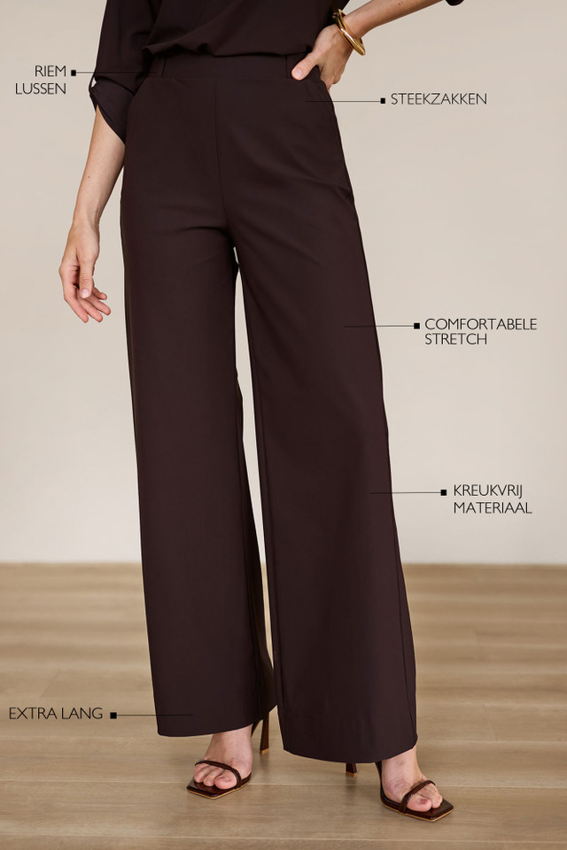 Omschrijving: De Lexie LONG bonded trousers van Studio Anneloes is stijlvol, krachtig en gemaakt voor lange benen. Met haar wijde pijpen, stevige Travelstof en diepe kleur Espresso is dit een broek met karakter. Dankzij de extra lengte sluit deze variant perfect aan bij een lengtemaat 36.