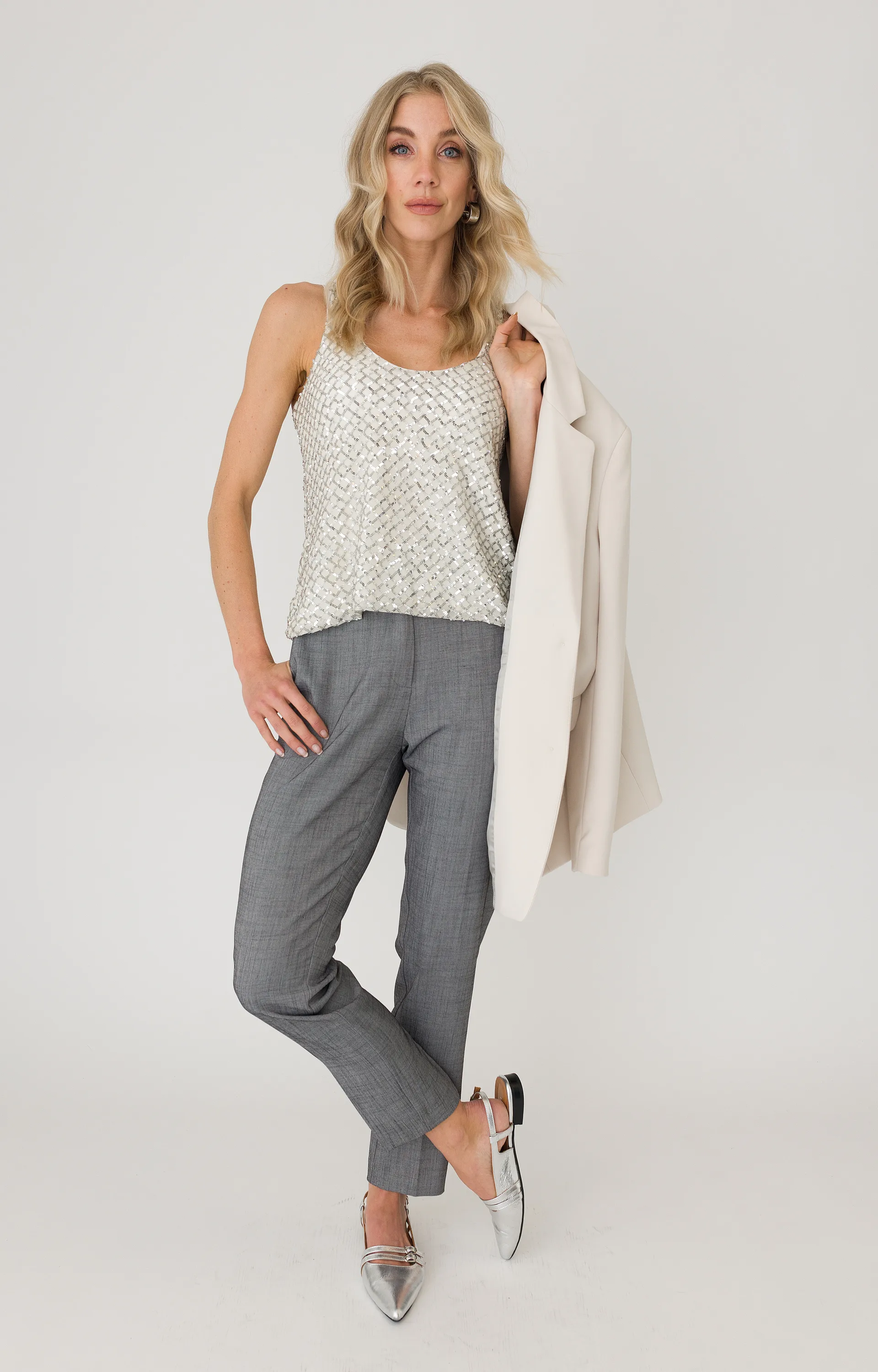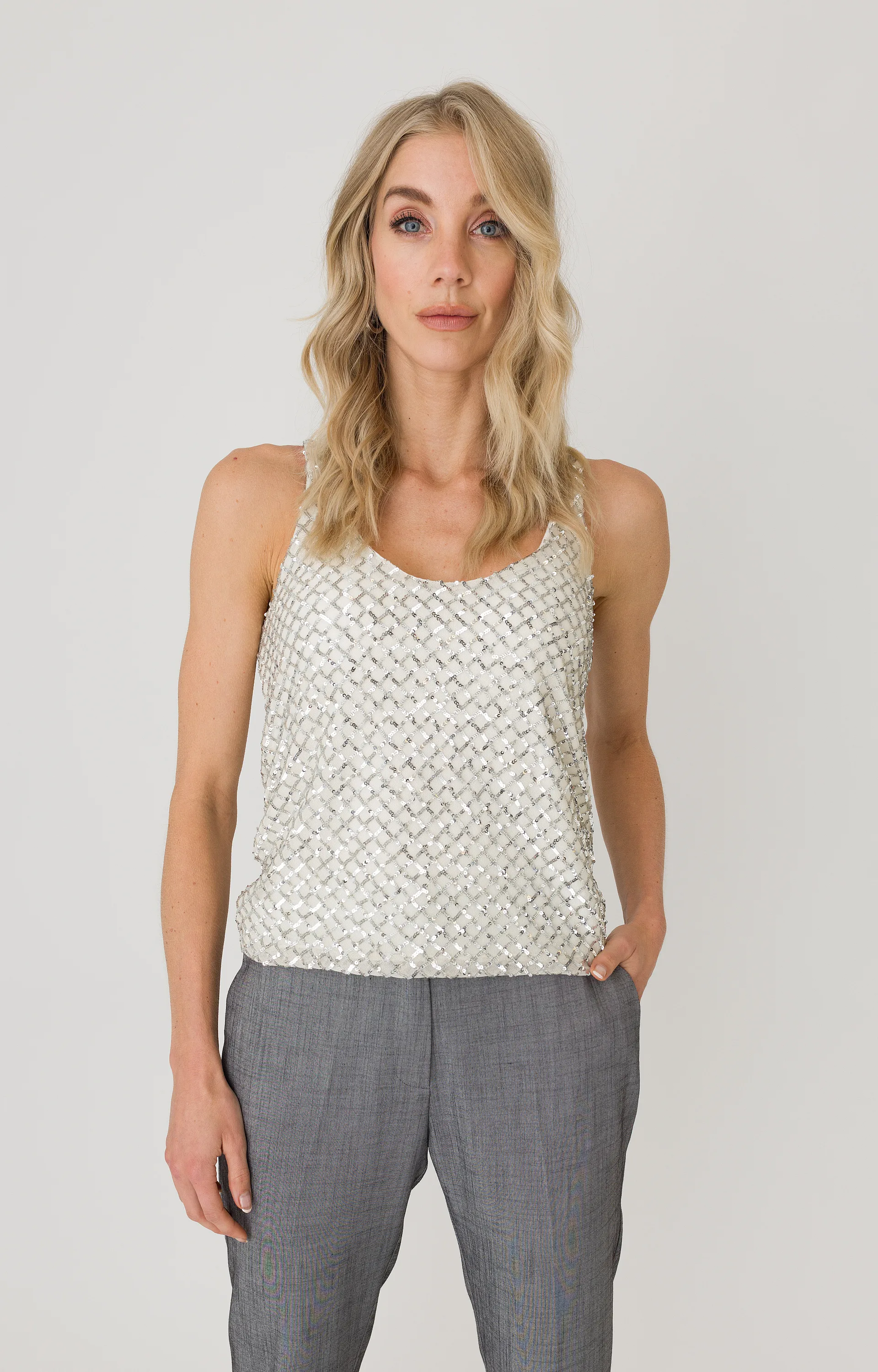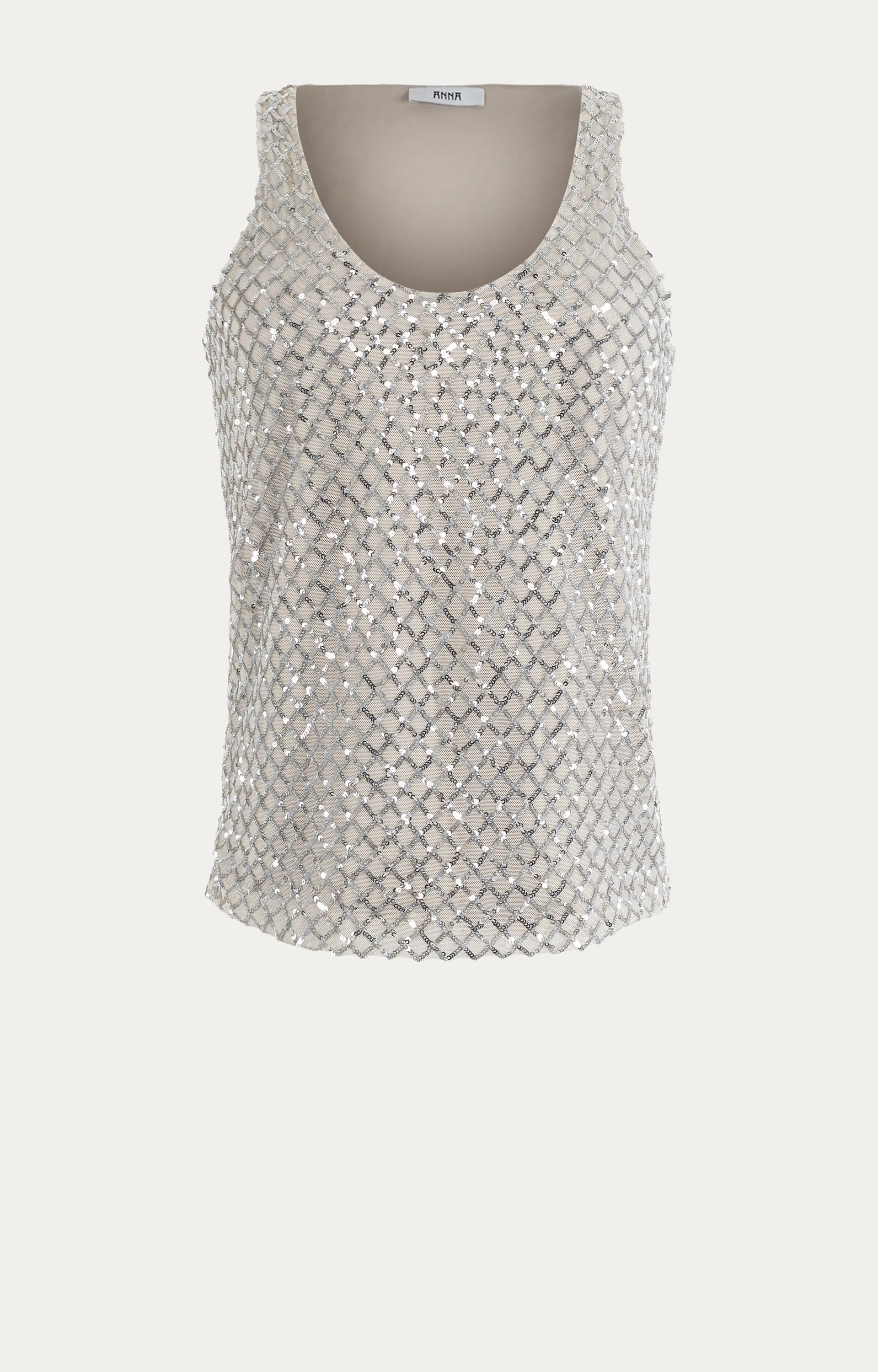 Deze mouwloze top van Anna is een opvallende keuze dankzij de zilverkleurige pailletten. De combinatie van viscose, polyester, polyamide en elastaan zorgt voor een comfortabele en licht stretchy pasvorm. De top heeft een ronde hals en een subtiele glans, perfect voor een feestelijke gelegenheid. Draag hem met een blazer of een elegante broek voor een complete look.