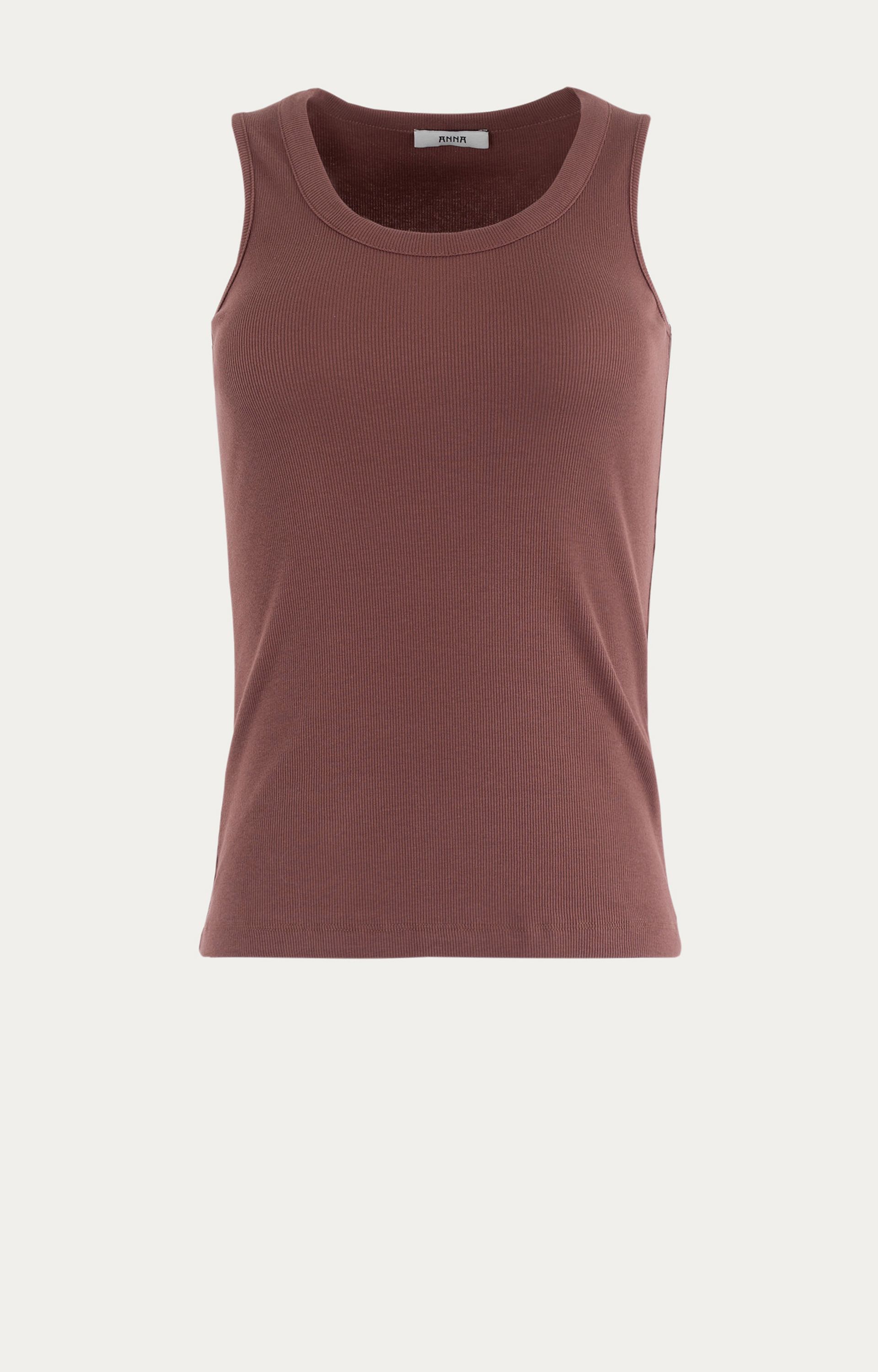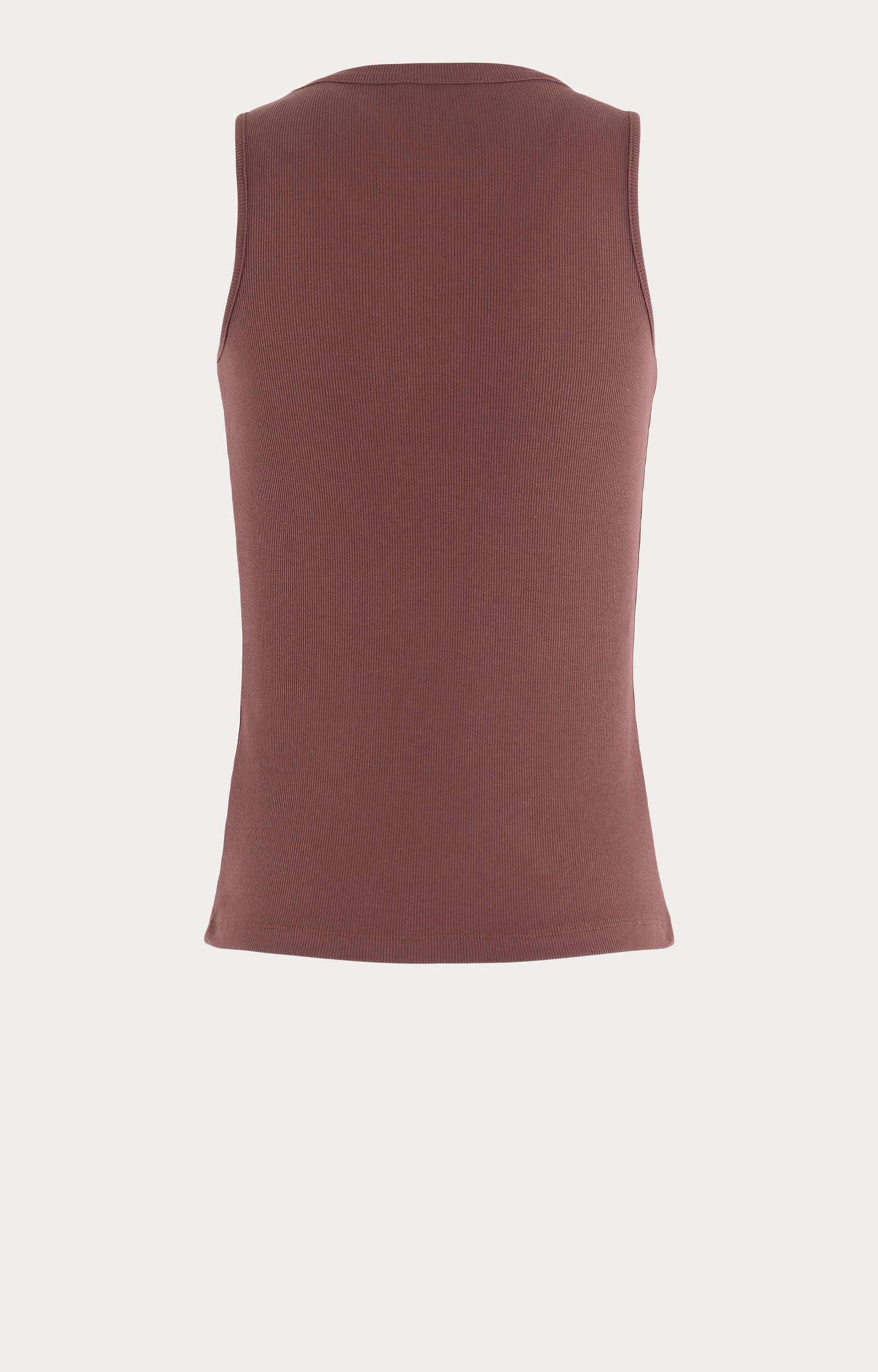 Omschrijving: Deze dark blush top van Anna is uitgevoerd in een tanktopmodel met een ronde hals. De ribstructuur geeft het ontwerp een subtiel detail en zorgt voor een comfortabele pasvorm. Dankzij de mix van katoen en elastaan voelt de stof zacht en licht rekbaar aan. Ideaal als basisstuk voor het winterseizoen, zowel los te dragen als onder een vest of blazer.