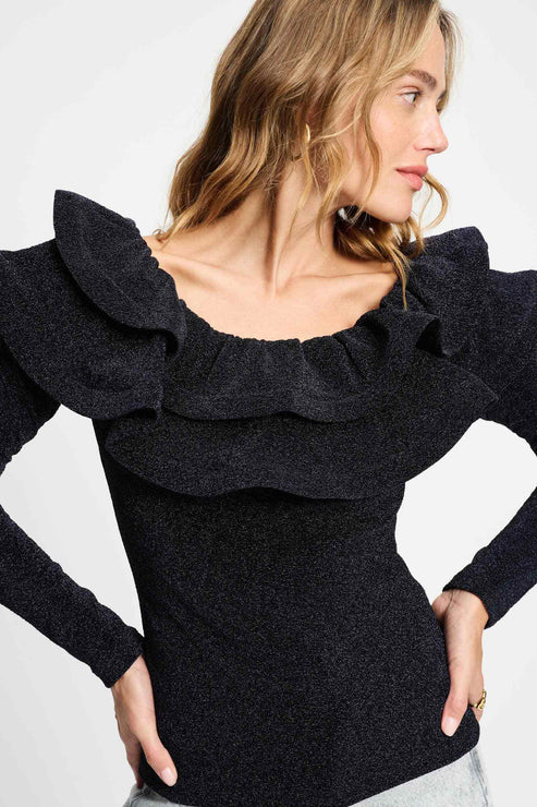 Omschrijving: Deze off-shoulder glittertop met dubbele volants is perfect voor een avondje uit of met de feestdagen te dragen.