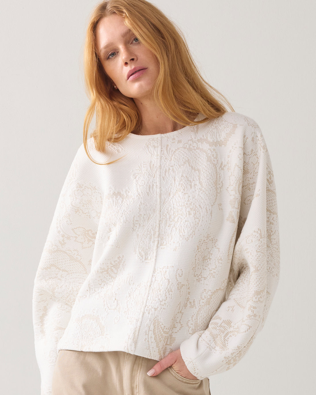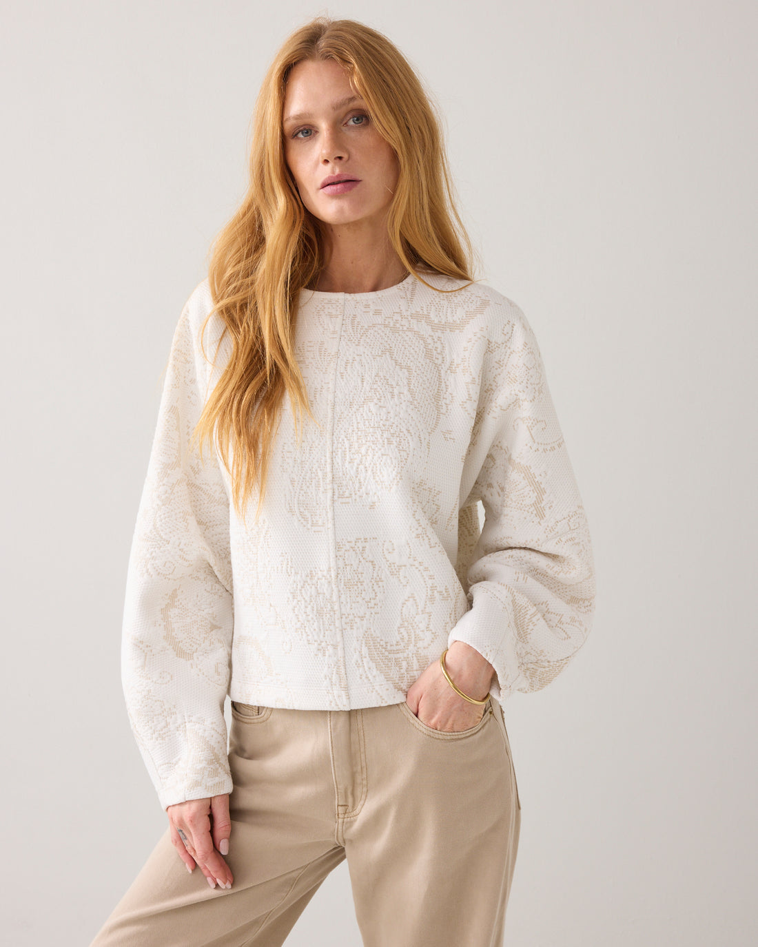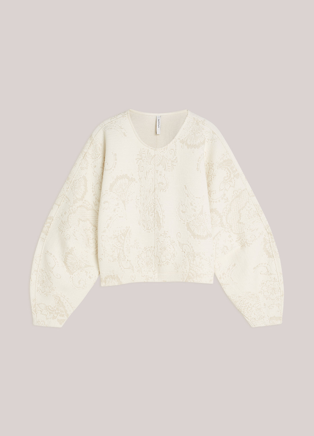 Omschrijving: Feestelijke top van stevige, foam jersey met ingeweven ornamenten in een subtiele glitter. De trui heeft een cropped boxy fit, ronde hals en aangeknipte ballonmouwen met een naad en plooien voor extra volume.