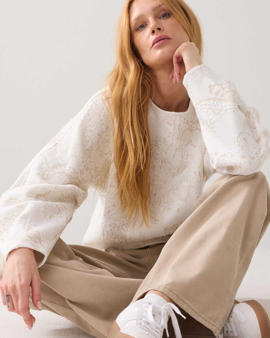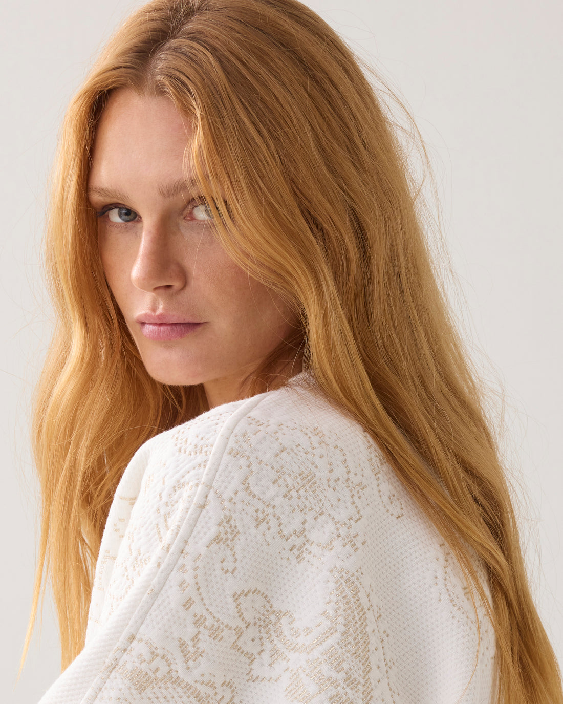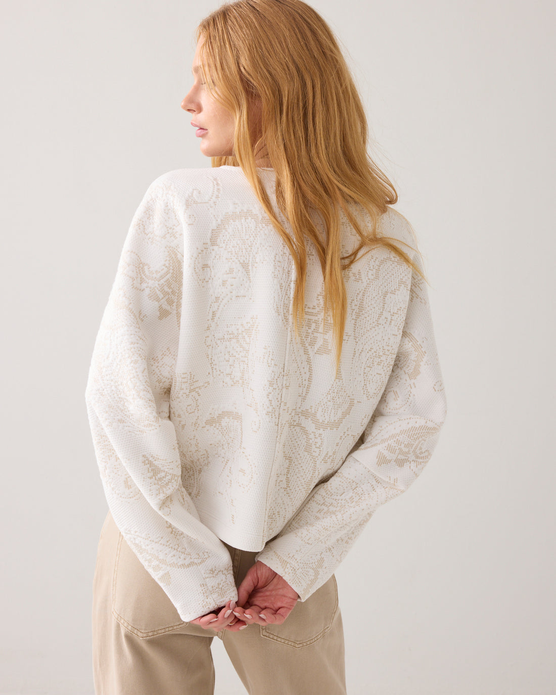 Omschrijving: Feestelijke top van stevige, foam jersey met ingeweven ornamenten in een subtiele glitter. De trui heeft een cropped boxy fit, ronde hals en aangeknipte ballonmouwen met een naad en plooien voor extra volume.