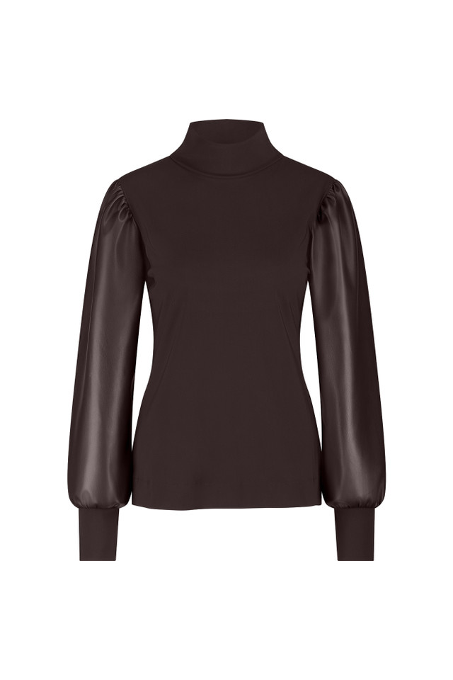 Deze top in de kleur Espresso combineert het beste van twee werelden: het comfort van travelstof met de moderne uitstraling van faux leather. De body, kol en manchetten zijn gemaakt van soepele travelstof, waardoor de top prettig aanvoelt en mooi aansluit. De mouwen zijn juist gemaakt van faux leather en geven door de grote plooien een krachtig silhouet.