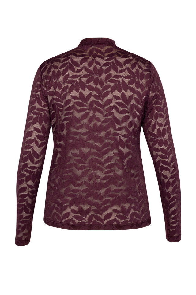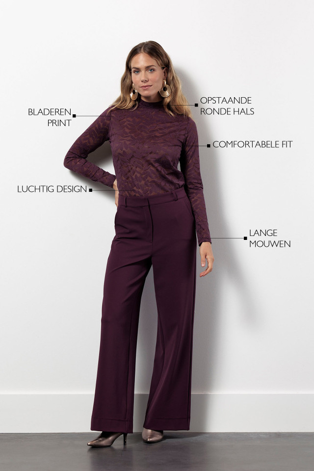 Deze top in de kleur Blackberry combineert moeiteloos vrouwelijkheid en comfort. De diepe paarstint straalt kracht uit en geeft je look een luxe, eigentijdse uitstraling. Het kant zorgt voor een subtiel spel van structuur, waardoor de top een elegante touch krijgt. Ideaal voor de herfst- en wintermaanden of feestelijke gelegenheden.