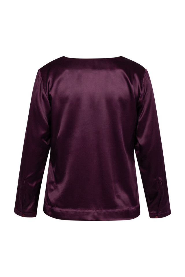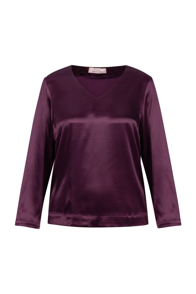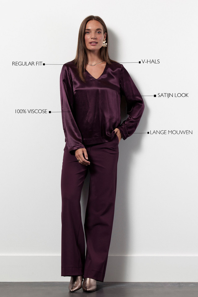 Omschrijving: De Madison satin top van Studio Anneloes in de kleur Blackberry is een elegante eyecatcher met een luxe uitstraling. De diepe, rijke tint in combinatie met de zachte glans van de satijnen stof geeft deze top een feestelijke en vrouwelijke touch. Dankzij de regular fit valt het item soepel langs het lichaam, terwijl de v-hals en de subtiele manchetten zorgen voor een verfijnde afwerking.
