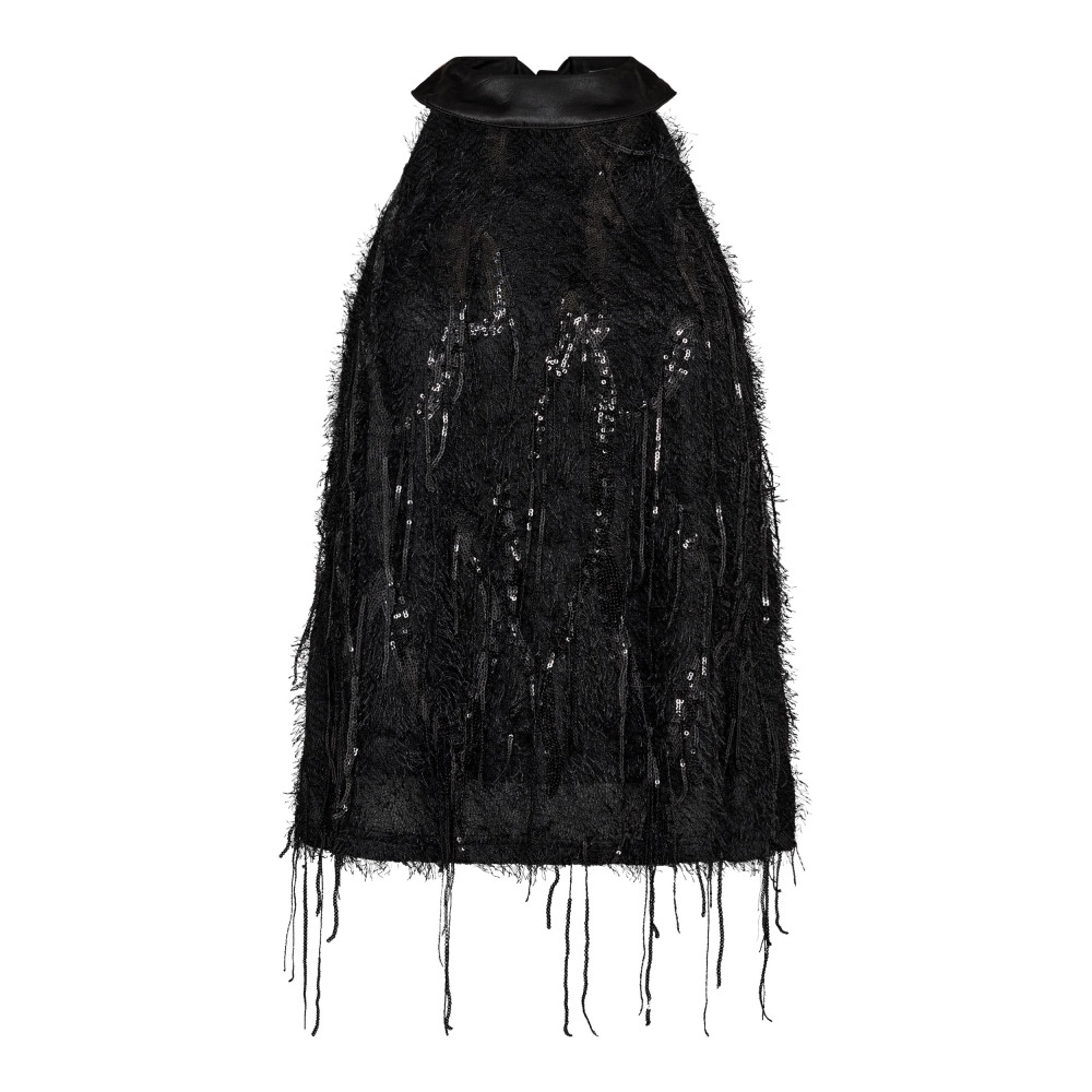 Zwarte haltertop van Co'Couture met een hoge hals en franjes. De top heeft pailletten en een gestructureerd oppervlak, wat een feestelijke uitstraling geeft.