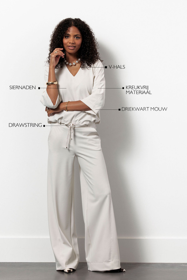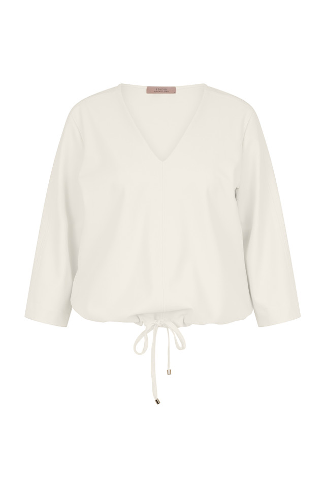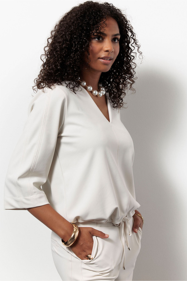 Deze lichte top is gemaakt van Bonded Travelstof: een stevige stof met comfortabele stretch die mooi in vorm blijft. De V-hals en siernaden geven de Odette een vrouwelijke en moderne uitstraling, terwijl het trekkoord onderaan zorgt voor een speels silhouet. De mouwen vallen iets wijder en hebben een driekwart lengte, wat het geheel luchtig maakt.