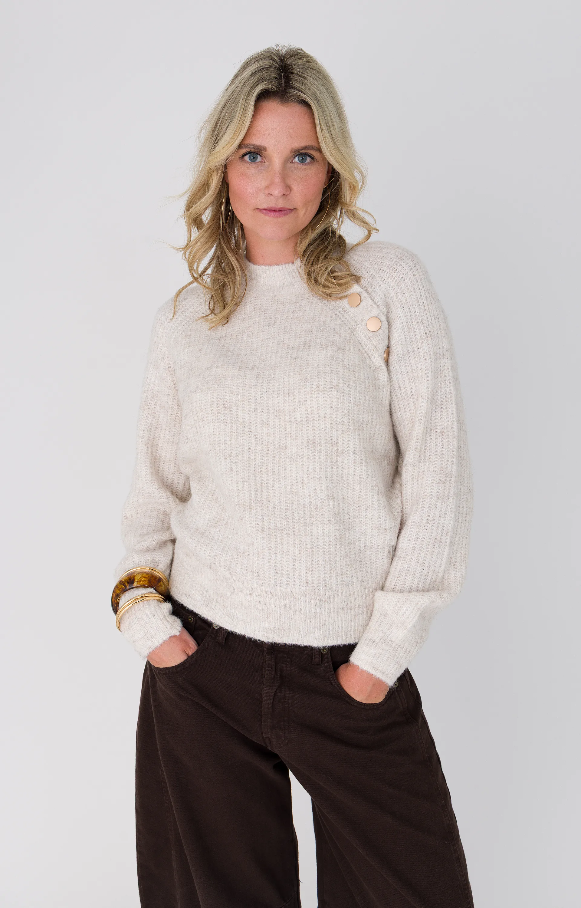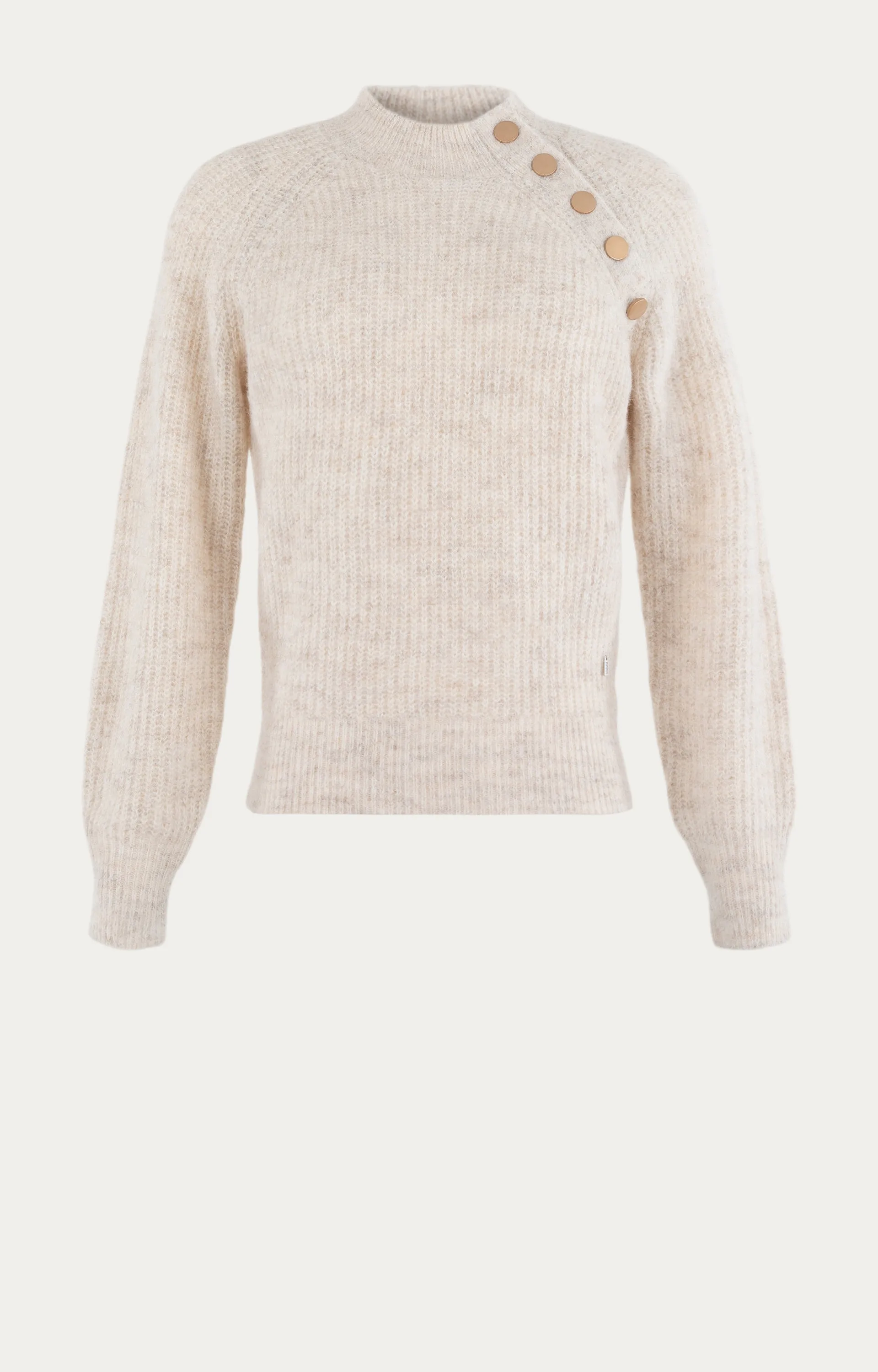 Deze beige Anna pullover is gebreid van een mix van polyamide, gerecycled polyester, polyester, acryl, wol en elastaan, perfect voor het winterseizoen. De pullover heeft een ronde opstaande halslijn en een schuine rij knopen bij de schouder voor een opvallend detail. De patentsteek zorgt voor een mooie structuur en draagt bij aan de comfortabele, warme pasvorm. Een ideale keuze voor zowel casual als meer geklede looks.