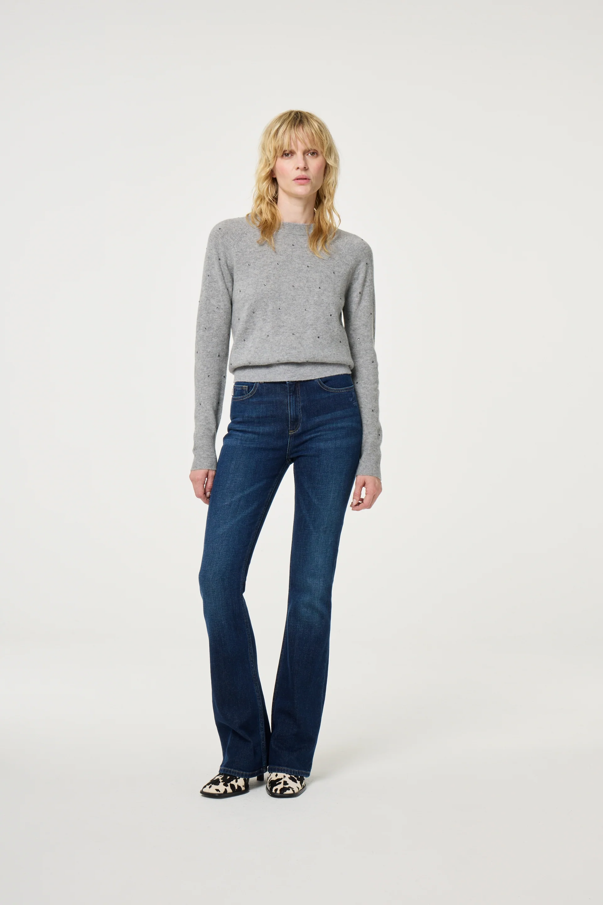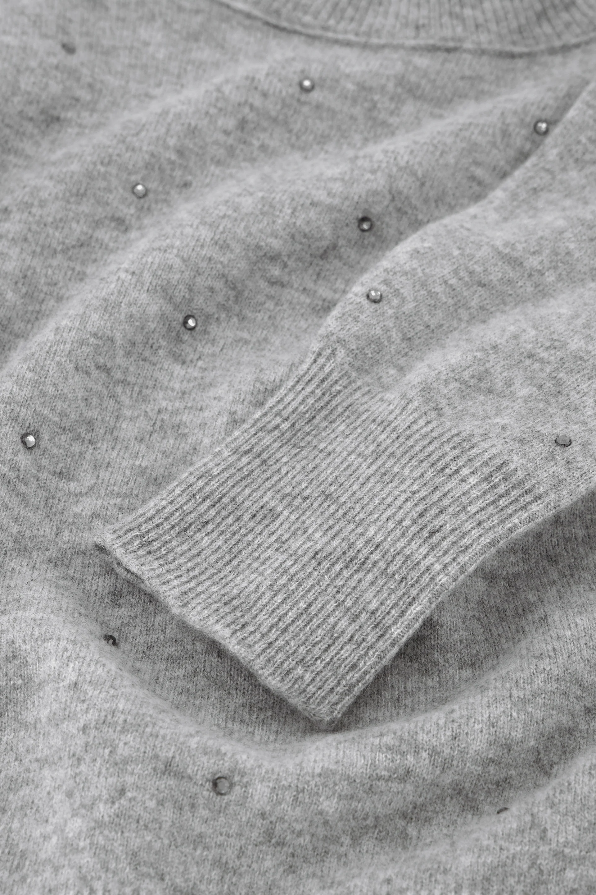 Deze grijze pullover is gemaakt van zachte stof en heeft een relaxed silhouet voor optimaal comfort. De strassteentjes op de borst zorgen voor een subtiele sprankeling. Perfect voor een casual-chique look met stijl en gemak.