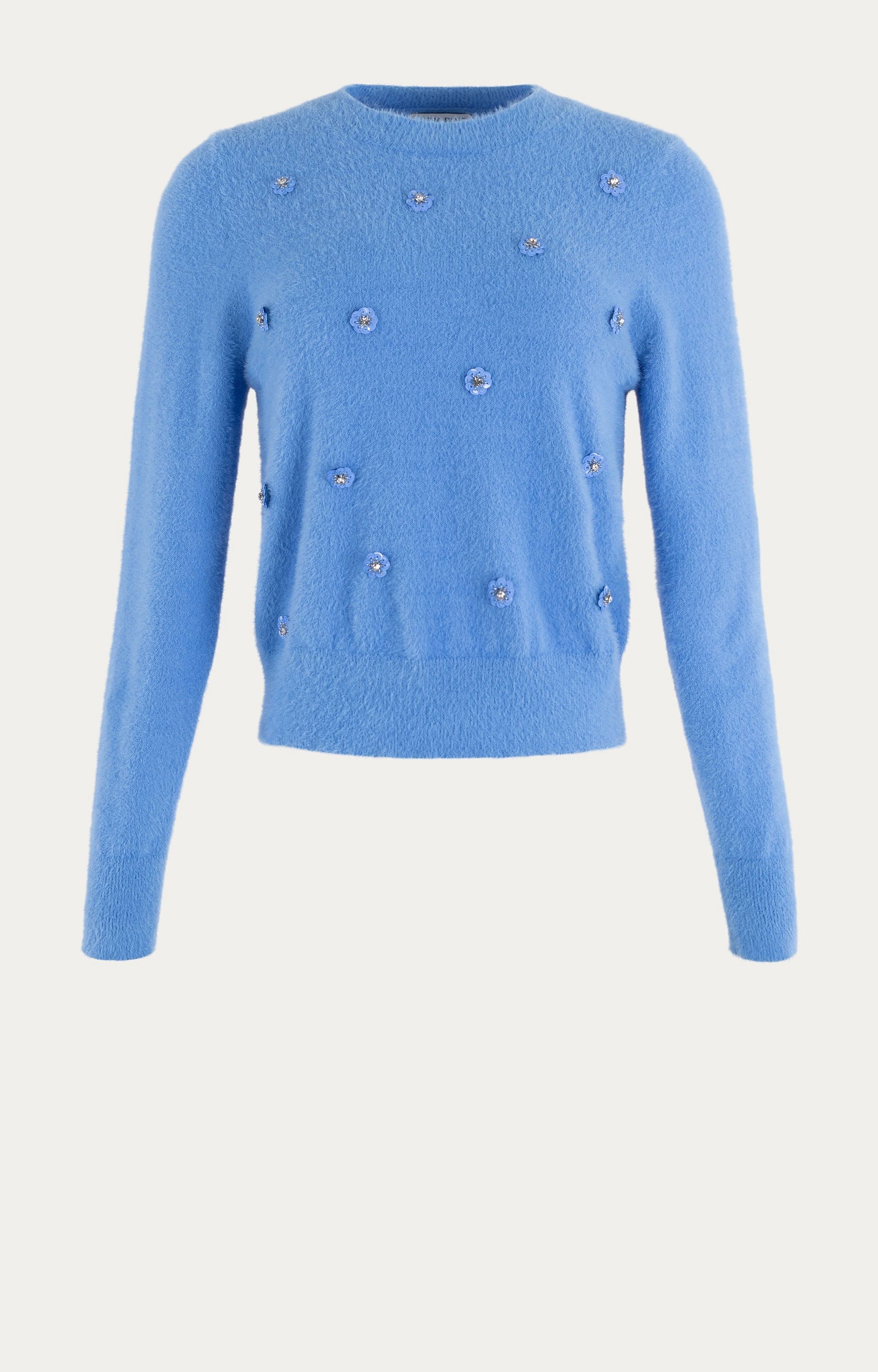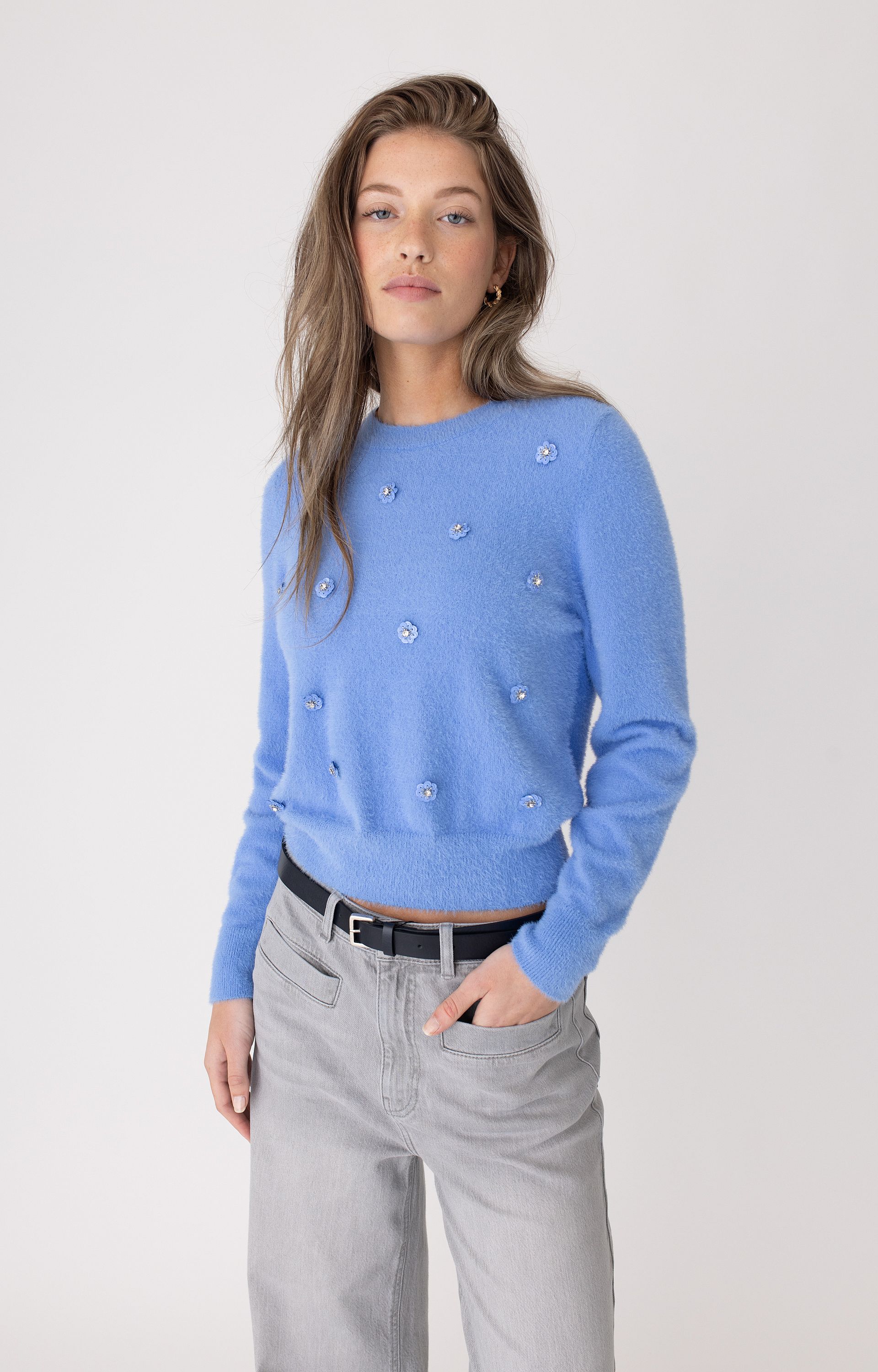 Warme wintertrui van Anna Blue met harige structuur en fijne bloemetjesapplicaties voorzien van een strass steentje in het midden. Gemaakt van een zachte mix van polyamide, katoen en cashmier. De ronde hals zorgt voor een comfortabele en neutrale pasvorm. Deze trui combineert moeiteloos met een jeans of rok. Ideaal voor koude dagen met een subtiel opvallend detail.