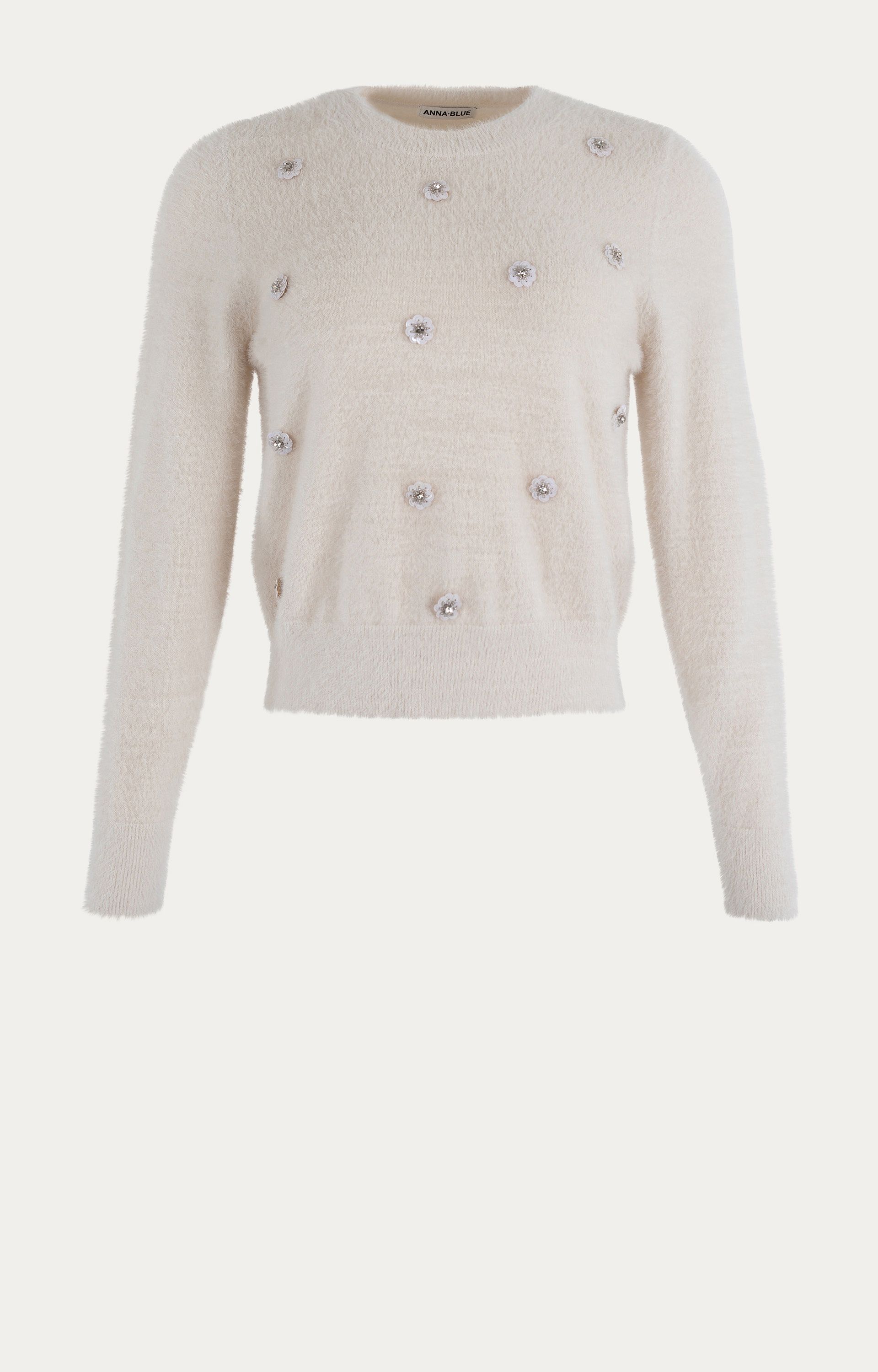 Warme wintertrui van Anna Blue in de kleur kit, met een harige structuur en fijne bloemetjesapplicaties voorzien van een strass steentje in het midden. Deze trui is gemaakt van een zachte mix van polyamide, katoen en cashmier, wat zorgt voor draagcomfort en warmte. De ronde hals geeft het model een comfortabele en neutrale pasvorm. Een veelzijdig item dat mooi combineert met zowel jeans als een rok. Ideaal voor koude dagen met een subtiel opvallend detail.