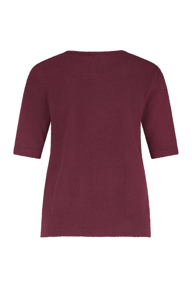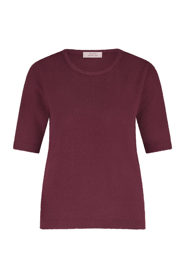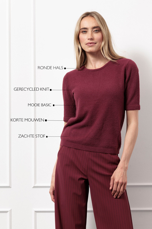 Deze bordeauxkleurige trui is het perfecte item voor laagjeslooks of als lichte knit op zichzelf. Dankzij de korte mouwen kun je er gemakkelijk een blazer of jasje overheen dragen zonder dat het gaat trekken bij de mouwen. De ronde hals maakt het model klassiek en geschikt voor elke gelegenheid.