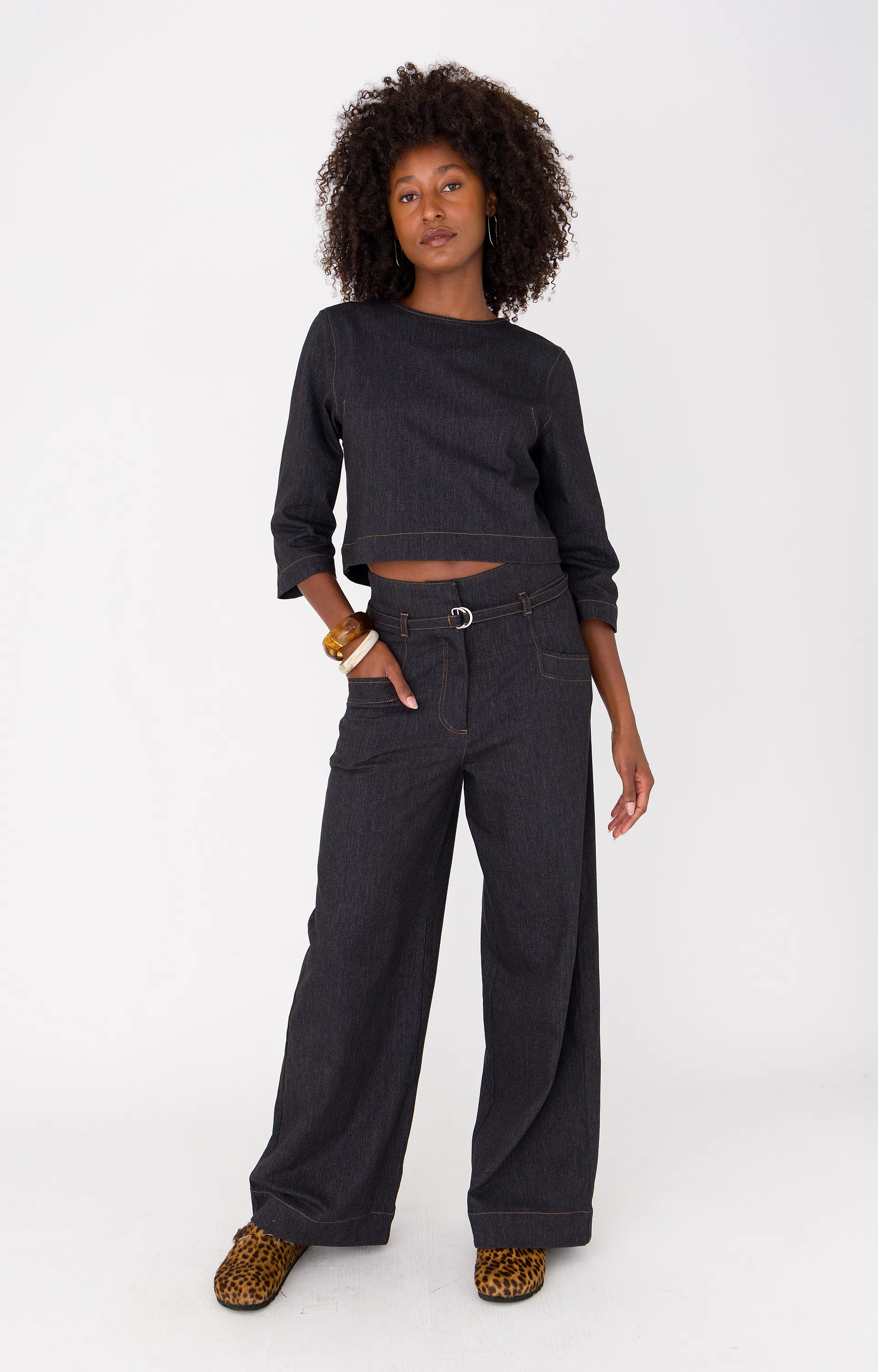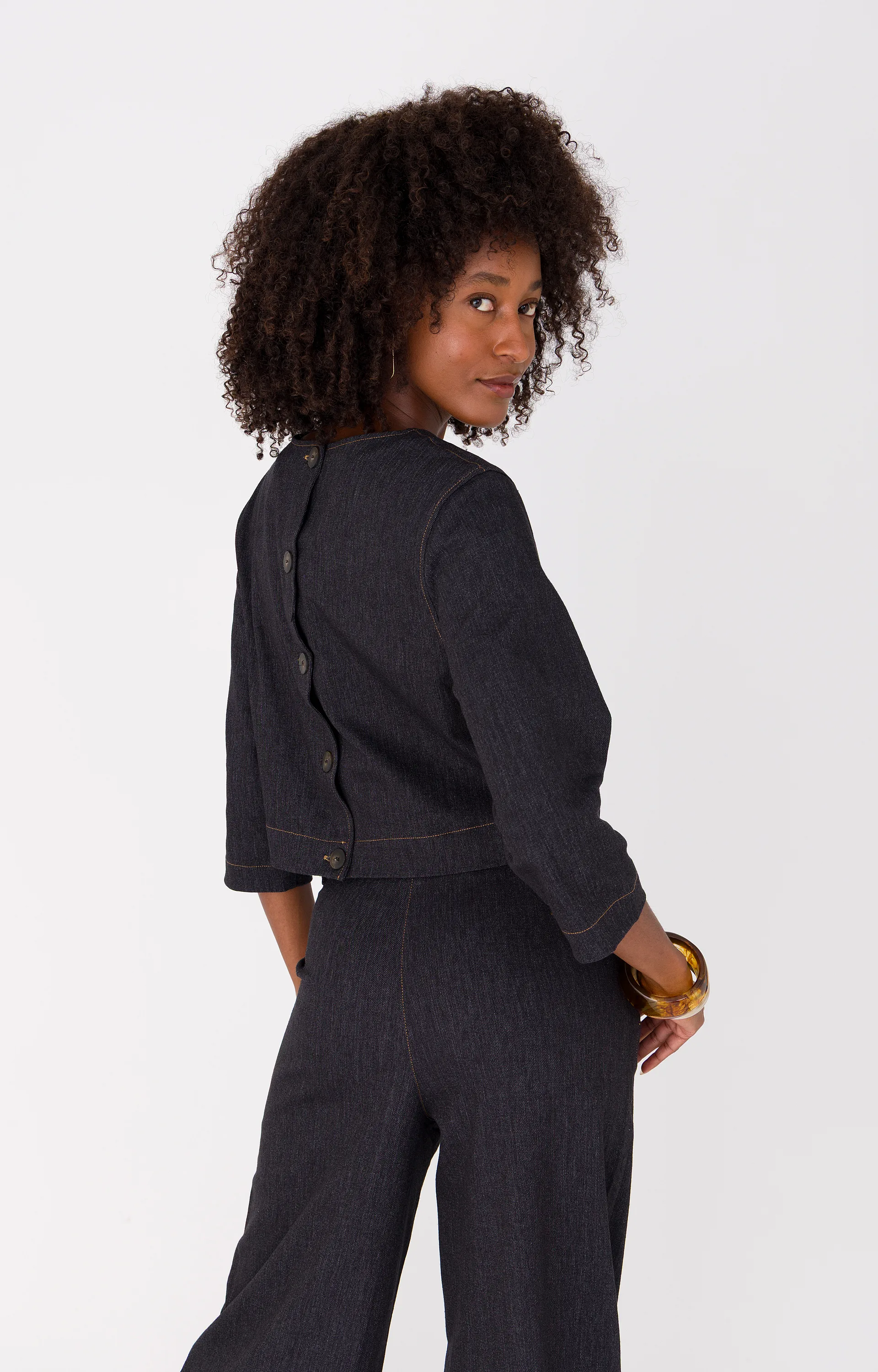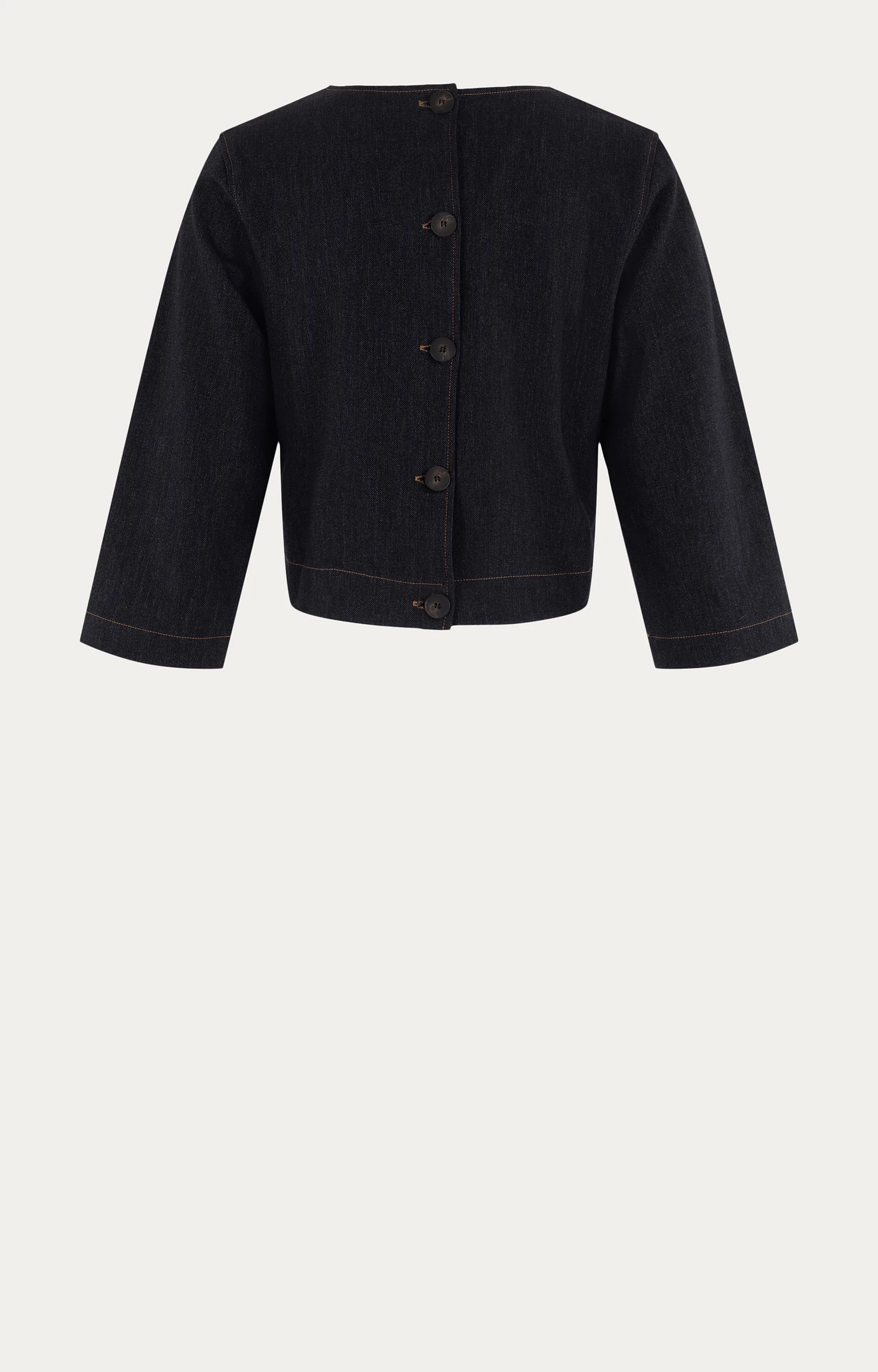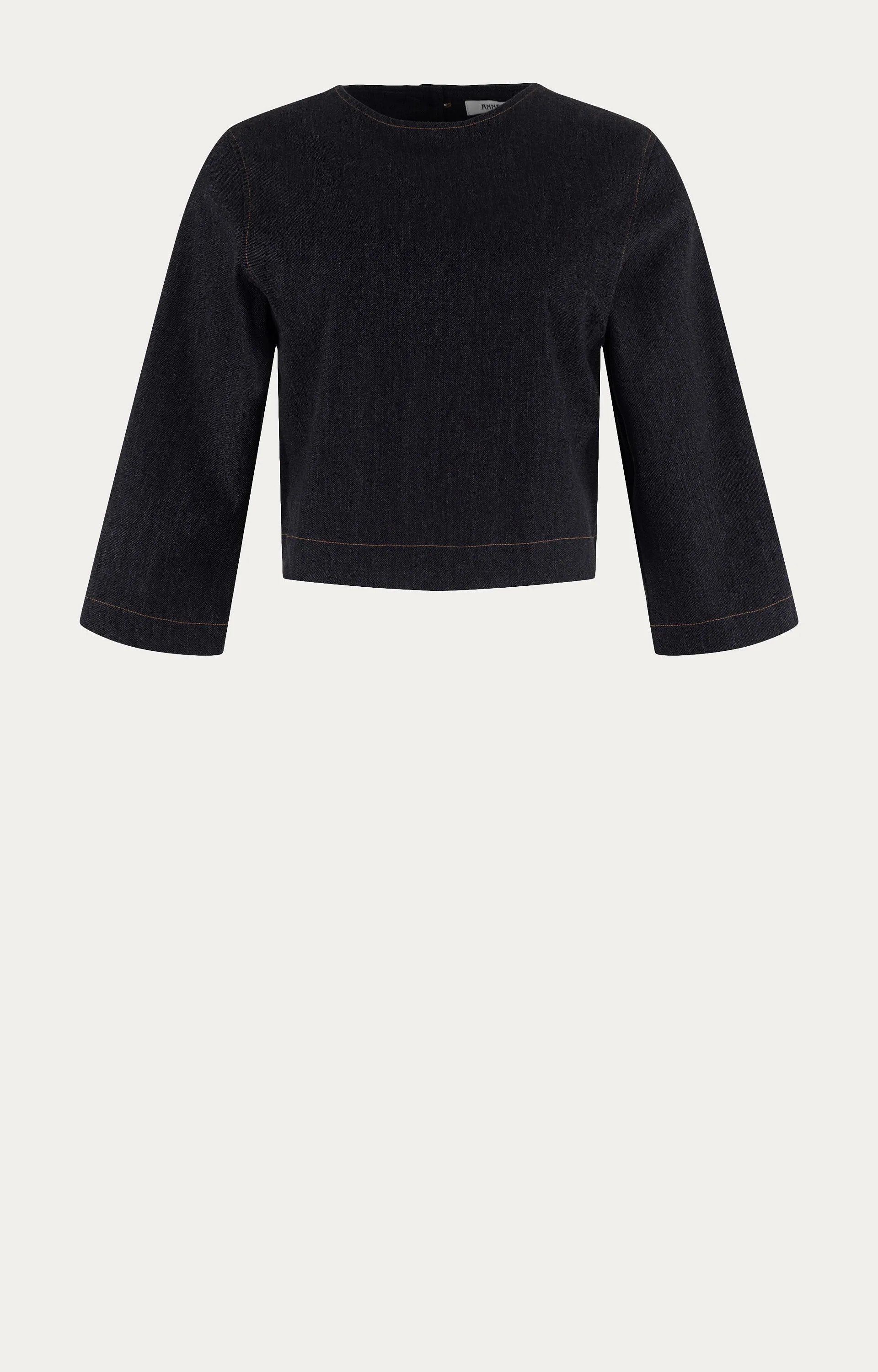 Deze blouse van Anna in off black solid is gemaakt van een stevige katoenmix en heeft een bijzondere dubbele draagwijze: je kunt de knoopsluiting zowel aan de voor- als achterkant dragen. Het kortere model met driekwart mouwen en ronde hals geeft de blouse een moderne uitstraling. Door de toevoeging van elastaan zit de blouse comfortabel en soepel, ideaal voor het winterseizoen. De zichtbare stiksels zorgen voor een subtiel accent.