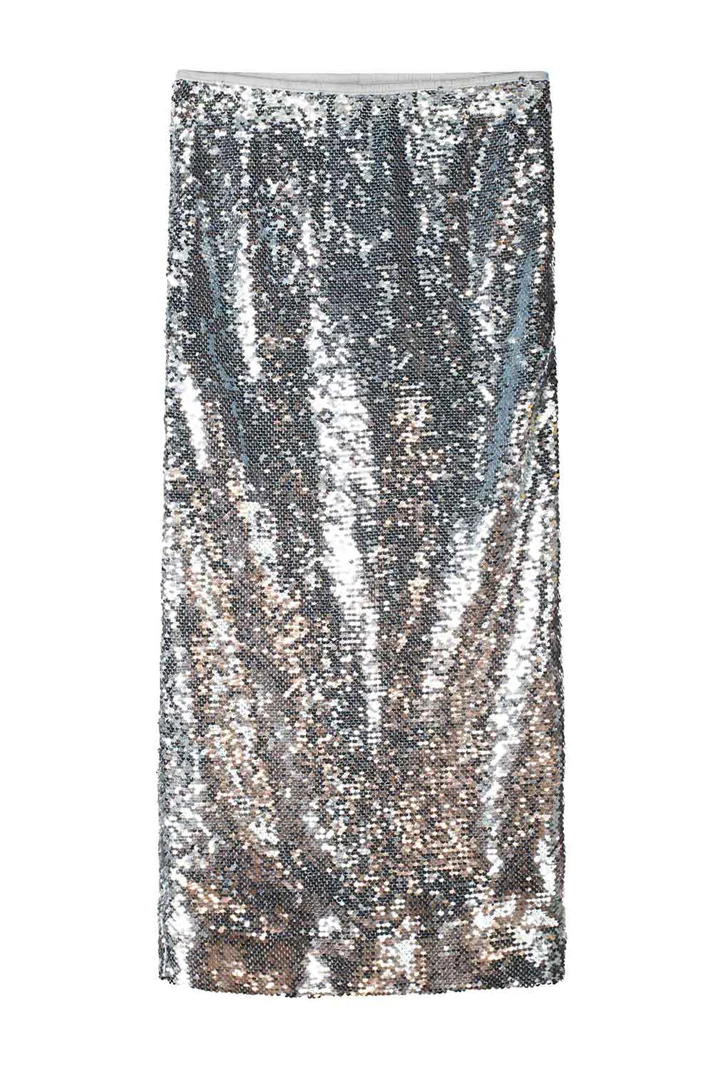 All eyes on shimmer. Deze paillettenrok vangt het licht bij elke stap en tilt je outfit in één keer omhoog.• Zilver• Pailletten met jersey lining• Midi-lengte• Rechte pasvorm• Elastische taillebandPasvorm: De rok heeft een rechte pasvorm. Het model op de foto is 176 cm lang en draagt maat 36.