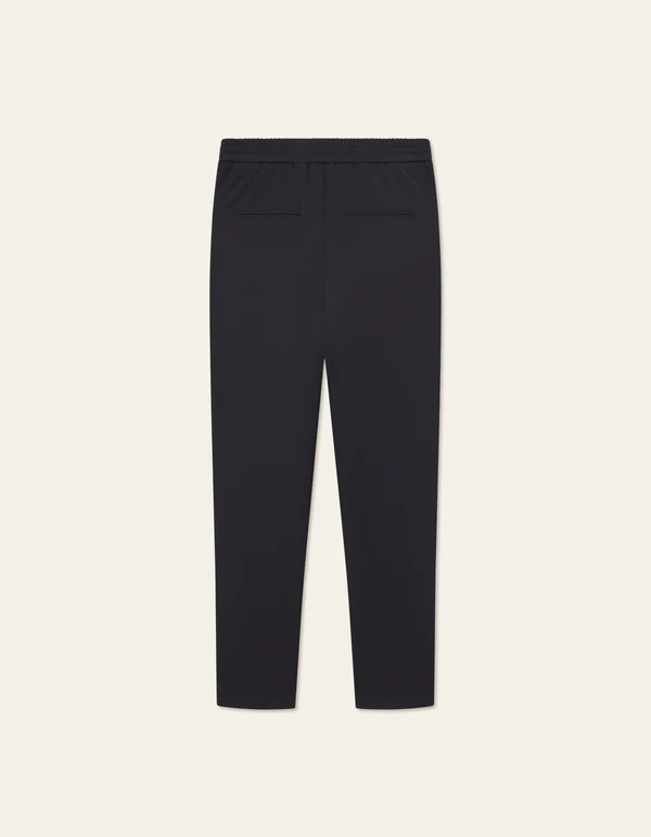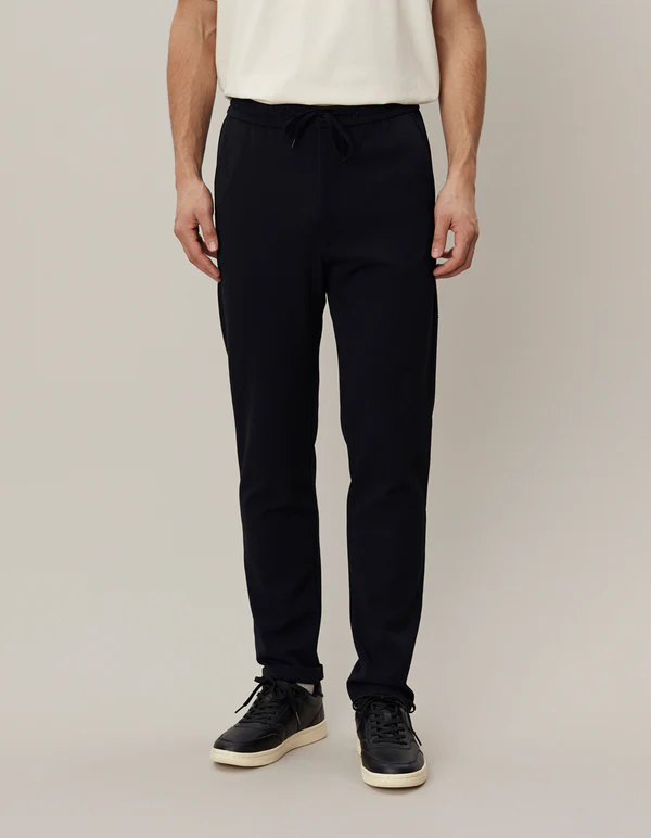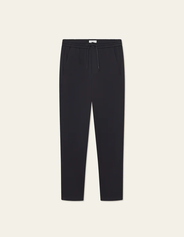 Een hybride van een pak en een sweatstof: het comfort van een elastische tailleband met trekkoord en de stof van een pantalon.