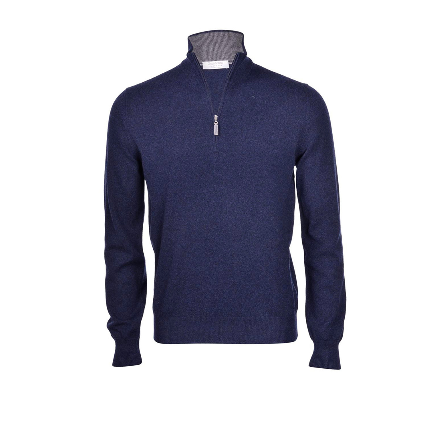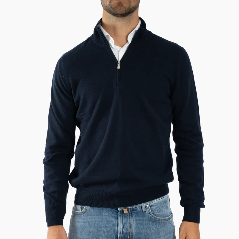 Donkerblauwe half-zip trui voor heren van Gran Sasso. Deze trui heeft een hogere kraag, een geribde onderband, een aansluitende pasvorm, is gemaakt van 100% virgin wol en is gemaakt in Italië.